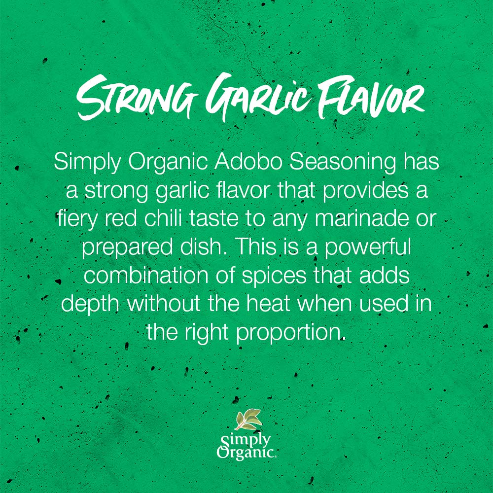 Q: What is Simply Organic Adobo Seasoning used for?A: Simply Organic Adobo Seasoning is an all-purpose blend primarily used to add depth and flavor to meats, poultry, fish, beans, and rice dishes. It's ideal for seasoning and marinades, enhancing the taste without adding heat.