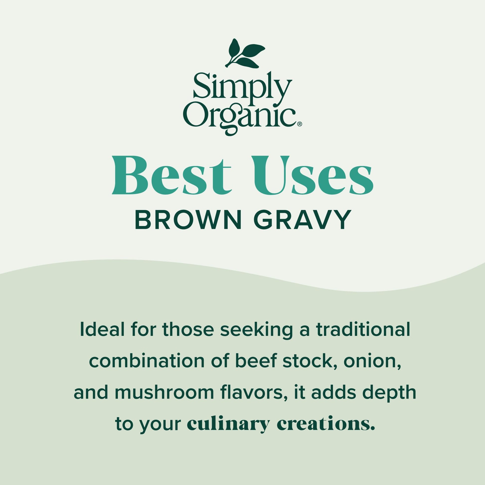 - Q: How do I prepare Simply Organic Brown Gravy? A: To prepare Simply Organic Brown Gravy, mix the contents of one .9-ounce packet with water according to the instructions on the package. Heat the mixture on the stove while stirring until it thickens to your desired consistency, then serve over meats, potatoes, or other savory dishes.