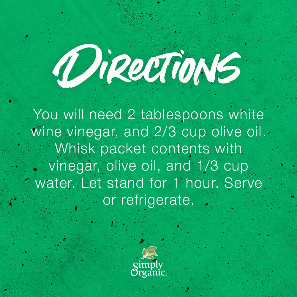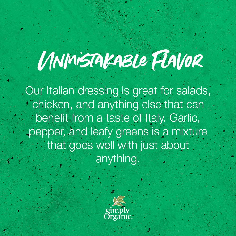 - Q: How can I use Simply Organic Italian Dressing Mix in my cooking? A: You can use Simply Organic Italian Dressing Mix as a quick and tasty addition to salads, marinades for chicken, or to season vegetables. It's versatile and can enhance any dish that benefits from a touch of Italian flavor.