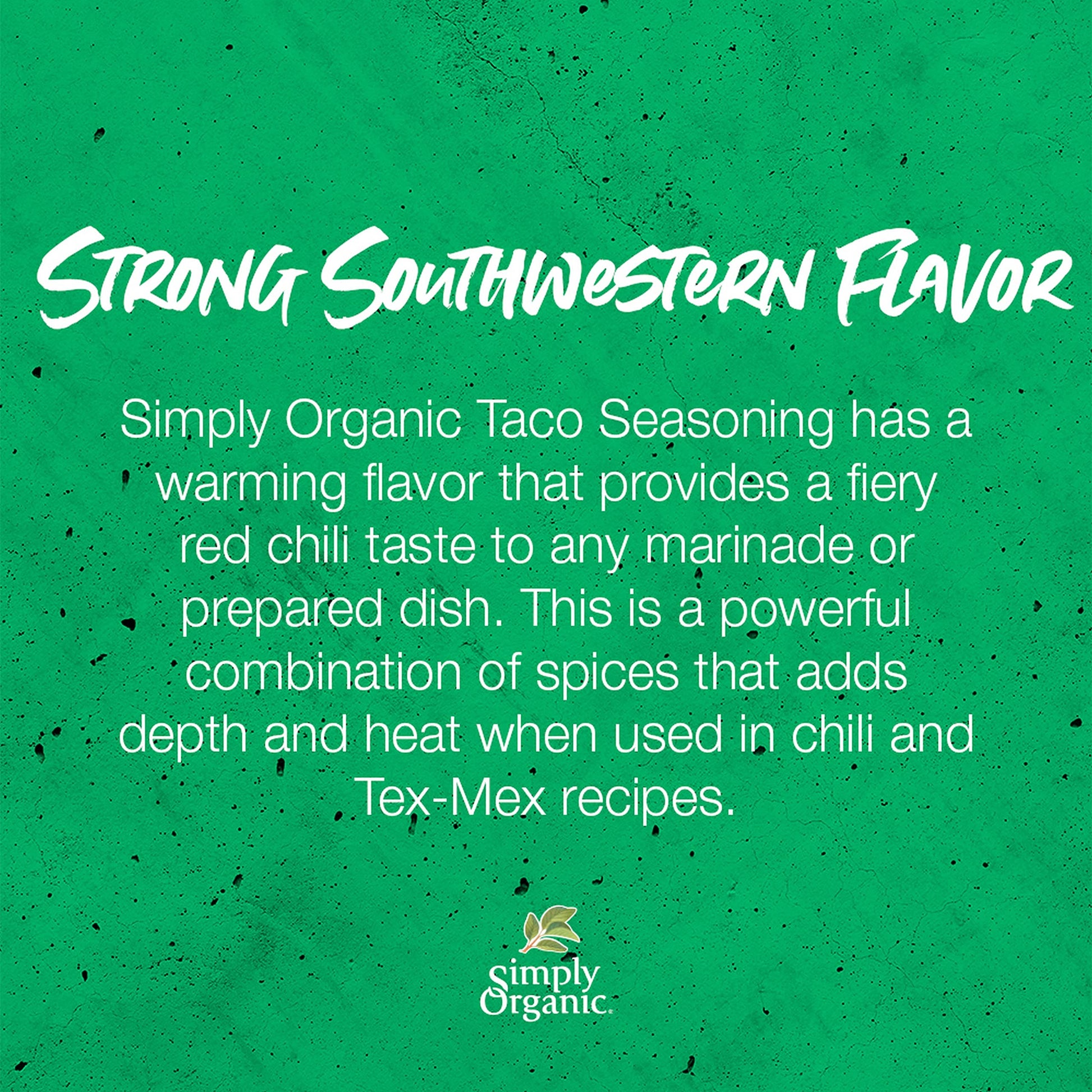 Simply Organic Spicy Taco, Seasoning Mix, Certified Organic, 1.13-Ounce Packets (Pack of 12). Put some Tex in your Mex. This fiery organic blend includes red chilies, paprika, cayenne, onion, and garlic and is perfect for rice, ground beef, tofu and whatever else fits in a tortilla