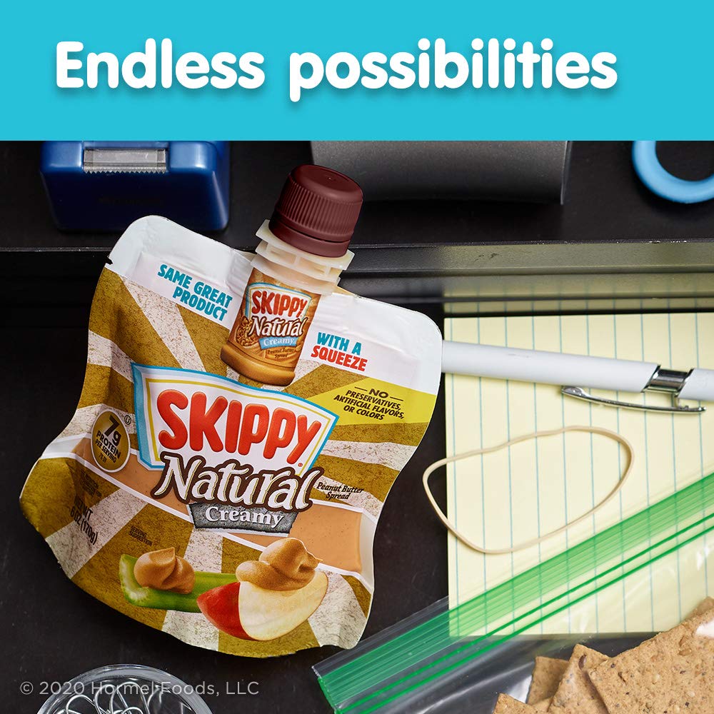 - Q: What makes SKIPPY Squeeze Natural Creamy Peanut Butter different from regular peanut butter? A: SKIPPY Squeeze Natural Creamy Peanut Butter is designed for convenience, coming in a portable squeeze package that eliminates the need for a spoon and reduces mess. It retains the same great taste as traditional SKIPPY peanut butter but is easier to use on-the-go.