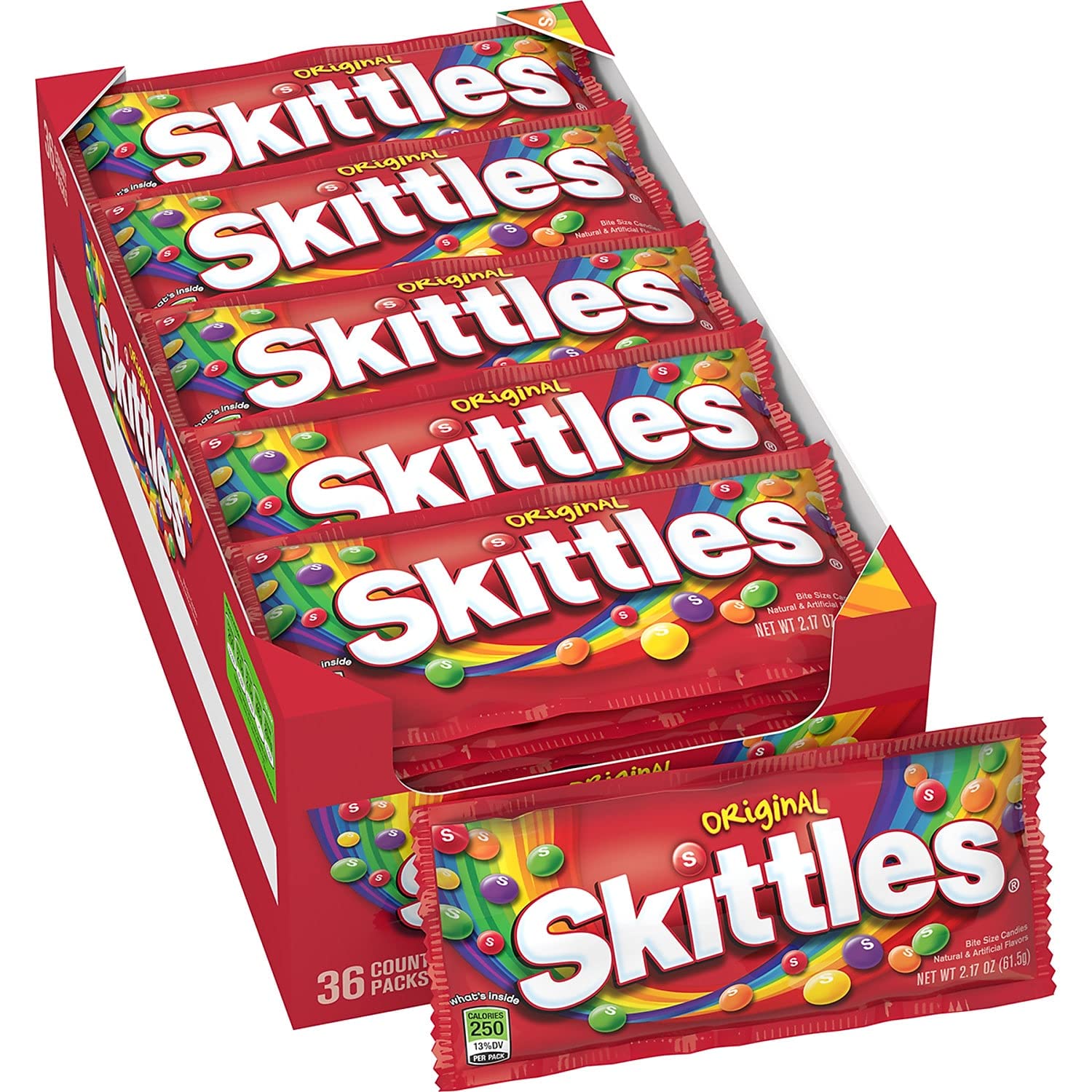 Q: How many packs are included in a bulk box of SKITTLES Candy?A: Each bulk box of SKITTLES Candy contains 36 individually wrapped 2.17-ounce packs, perfect for sharing or enjoying over time.