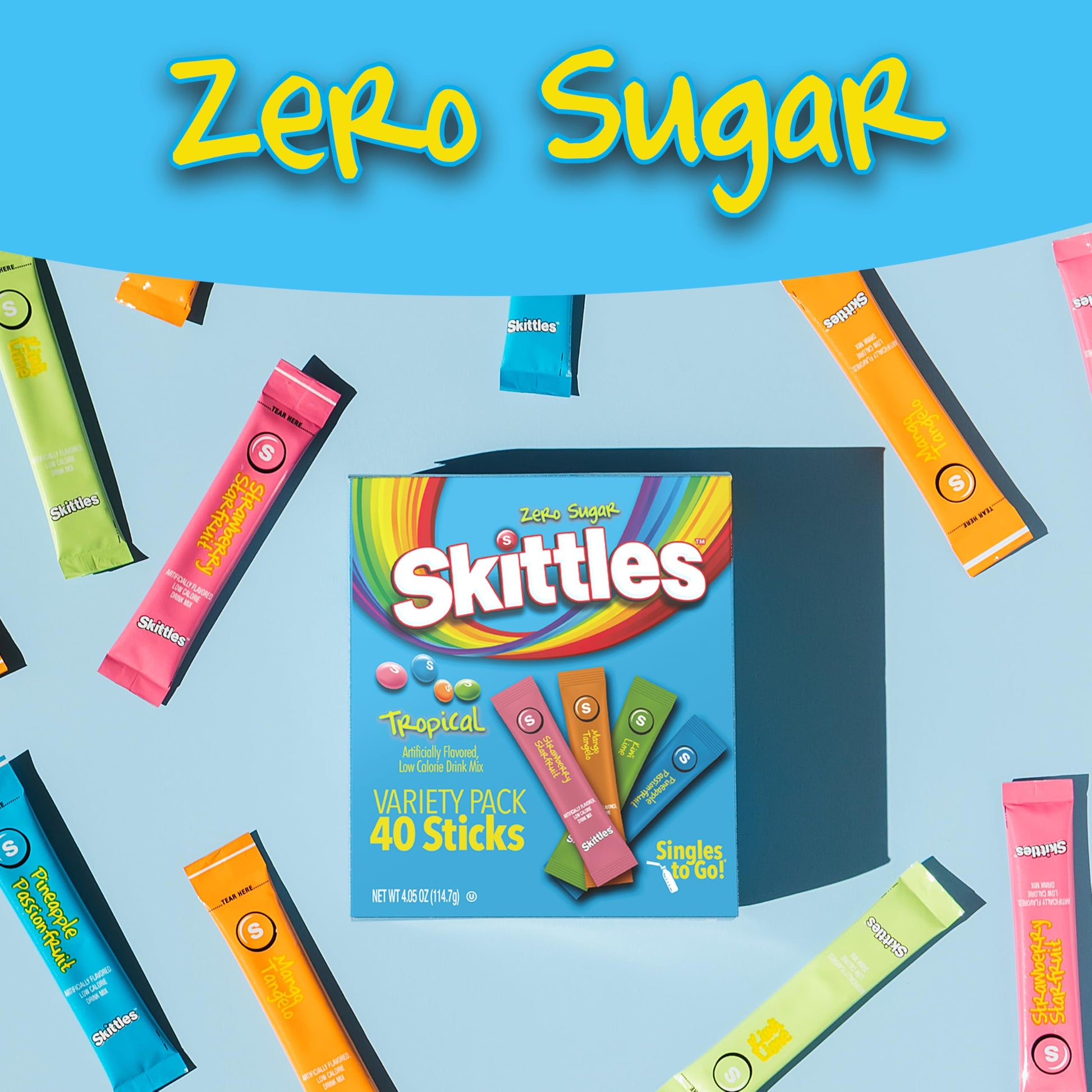 Q: How many servings are in the Skittles Singles To Go pack?A: The Skittles Singles To Go Tropical Variety Pack contains 40 single-serving sticks, providing plenty of delicious drink mix for you to enjoy.