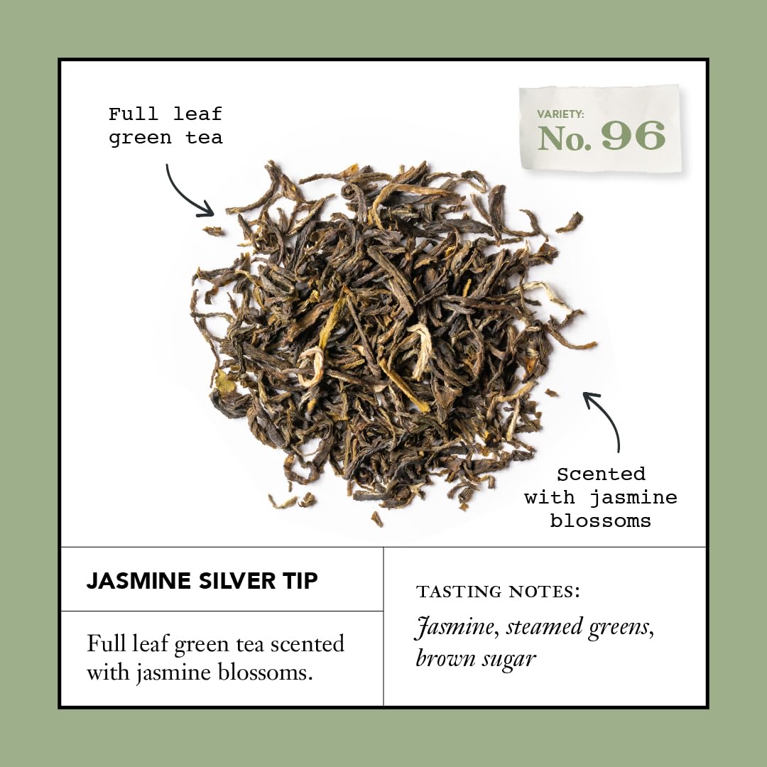 Jasmine Silver Tip No. 96: Contains 36 Green Tea Bag Sachets Of Our Green Tea Leaves Harvested From China'S Fujian Province And Mixed With Freshly Picked Jasmine Buds | Caffeinated & Complex Tea Blend: Our Caffeinated And Complex Jasmine Silver Tip Green Tea Is Perfect For Any Time Of The Day With Tasting Notes Of Jasmine, Steamed Greens, And Brown Sugar | Sustainably Grown Full Leaf Tea: Unlike Large-Scale Machine-Made Tea, Smith Tea'S Sustainably Grown Full Leaf Teas Are Artfully Made In Smaller Batches For Superior Taste | 36 Plant-Based Tea Sachets: Our Microplastic-Free Tea Bag Sachets Are Made From Plants And 100% Commercially Compostable, Making It Safe For You And Our Planet | Smith Tea'S Signature Blends And Infusions: Enjoy Smith Tea'S Full Collection Of Premium Full Leaf Green, Herbal, Black, And Matcha Teas Any Time Of The Day For An Invigorating Tea Experience