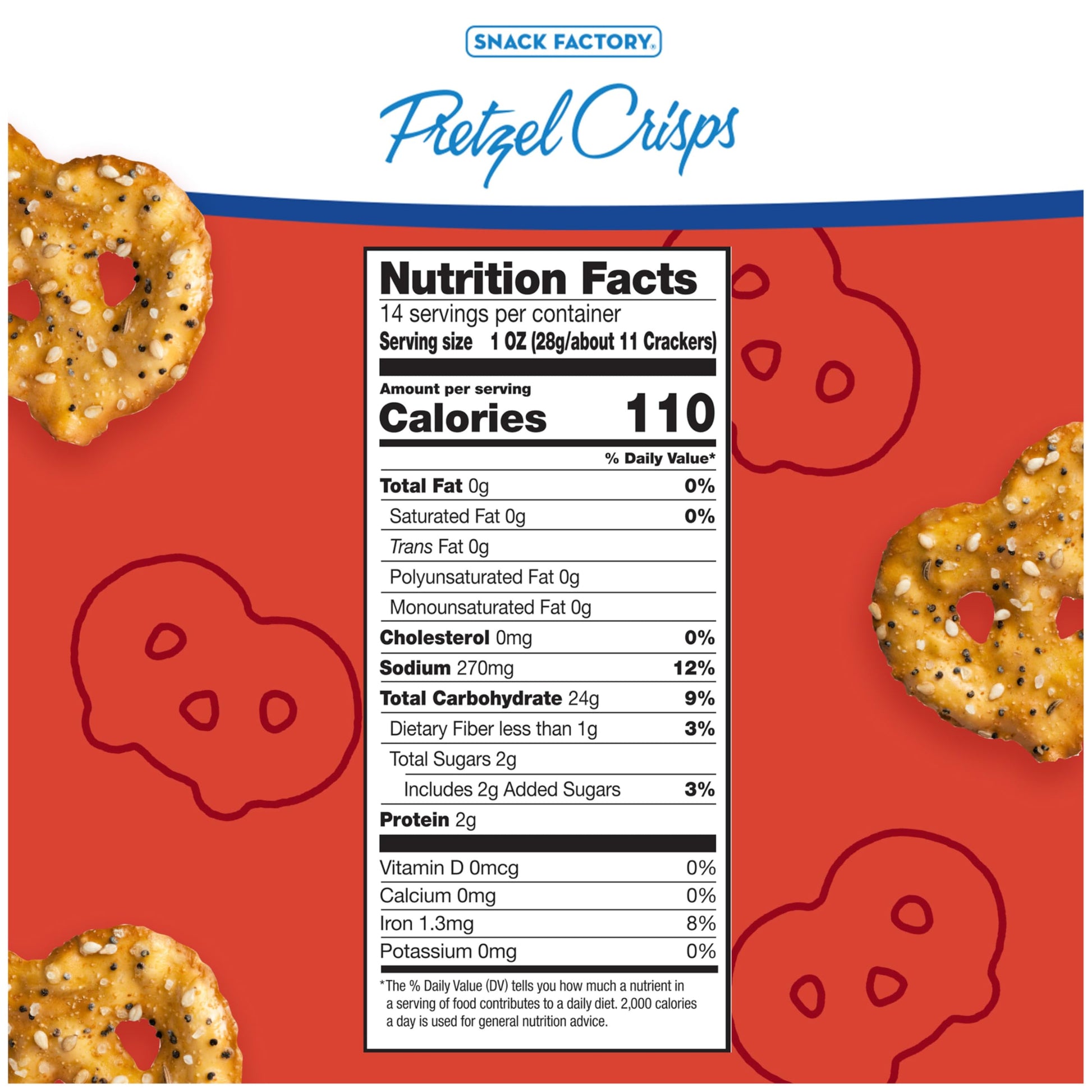 Dip Or No Dip, Snack Factory Everything Pretzel Crisps Are Flat-Out Delicious. Our Everything Pretzel Crisps Are Generously Sprinkled With Poppy Seeds, Onion, Garlic And Salt. A Modern Twist On A Classic, These Thin, Crunchy Pretzel Chips Give You The Best Part Of Traditional Pretzels Without The Doughy Center. Theyre Perfectly Seasoned And Baked Just Right For A Satisfying Crunch In A Sturdy Shape That'S Dippable, Toppable And Deliciously Snackable. Snack Factory Everything Pretzel Thins Are Tasty On Their Own And They Pair Perfectly With Hummus, Cream Cheese Or Any Of Your Favorite Dips. Top These Thin Pretzels With Warm Spinach And Artichoke Dip For An Easy Appetizer For Your Next Party. Snack Factory Pretzel Crisps Are Made With Quality Ingredients And Are Non-Gmo Project Verified. This 14-Ounce Resealable Party Size Bag Contains About 14 Servings Of Pretzel Crackers And Is Perfect For Serving To Guests Or Stashing In Your Pantry To Satisfy Your Cravings For Salty Snacks. In Addition To Everything, Snack Factory Pretzel Chips Are Available In Other Unique Flavors Such As Buffalo Wing, Garlic Parmesan And Everything.