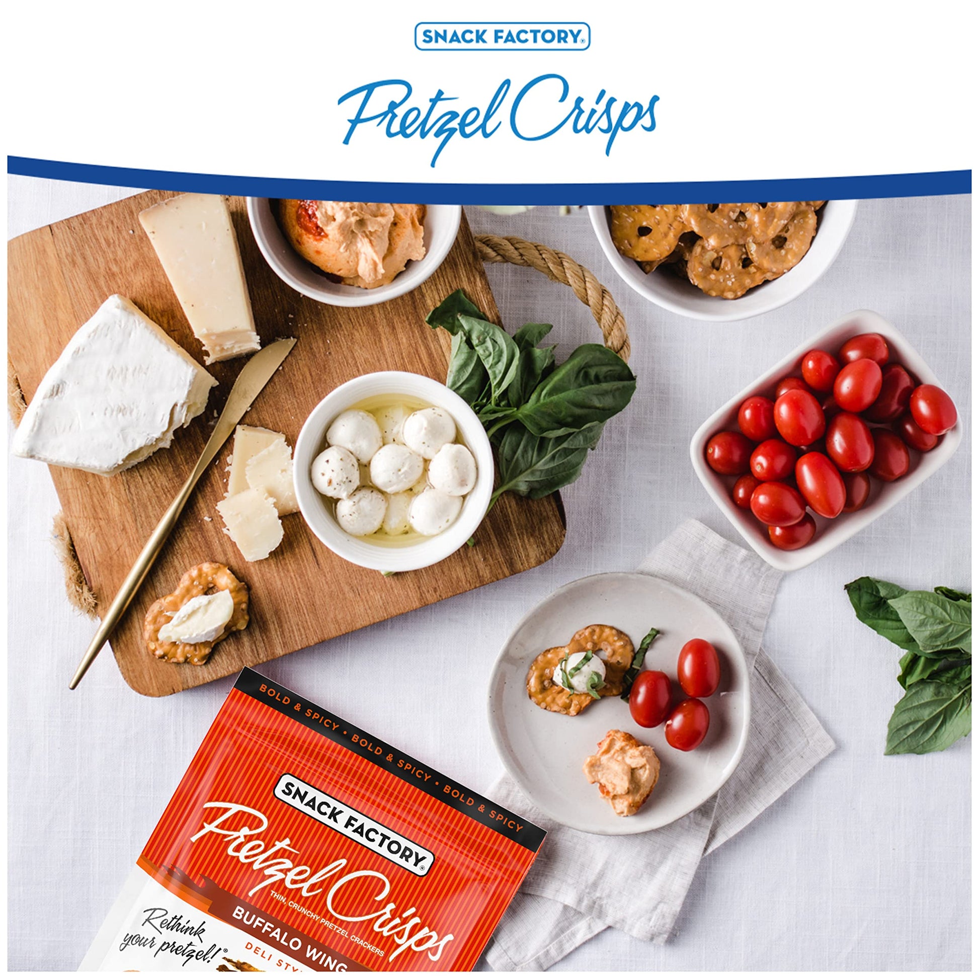 - Q: What flavors are available in the Snack Factory Pretzel Crisps line? A: In addition to the Buffalo Wing flavor, Snack Factory offers a variety of unique flavors including Everything, Garlic Parmesan, and Cheddar Cheese. Each flavor provides a different taste experience while maintaining the same satisfying crunch.