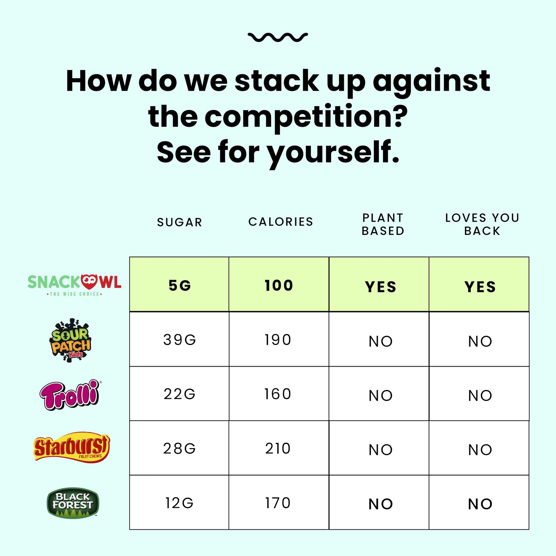 Q: How do Snack Owl Vegan Sour Gummy Candies compare to traditional gummy candies?A: Snack Owl Vegan Sour Gummy Candies offer a tastier and healthier alternative to traditional gummy candies. They are lower in sugar and calories, providing a sweet treat without the guilt associated with conventional options.