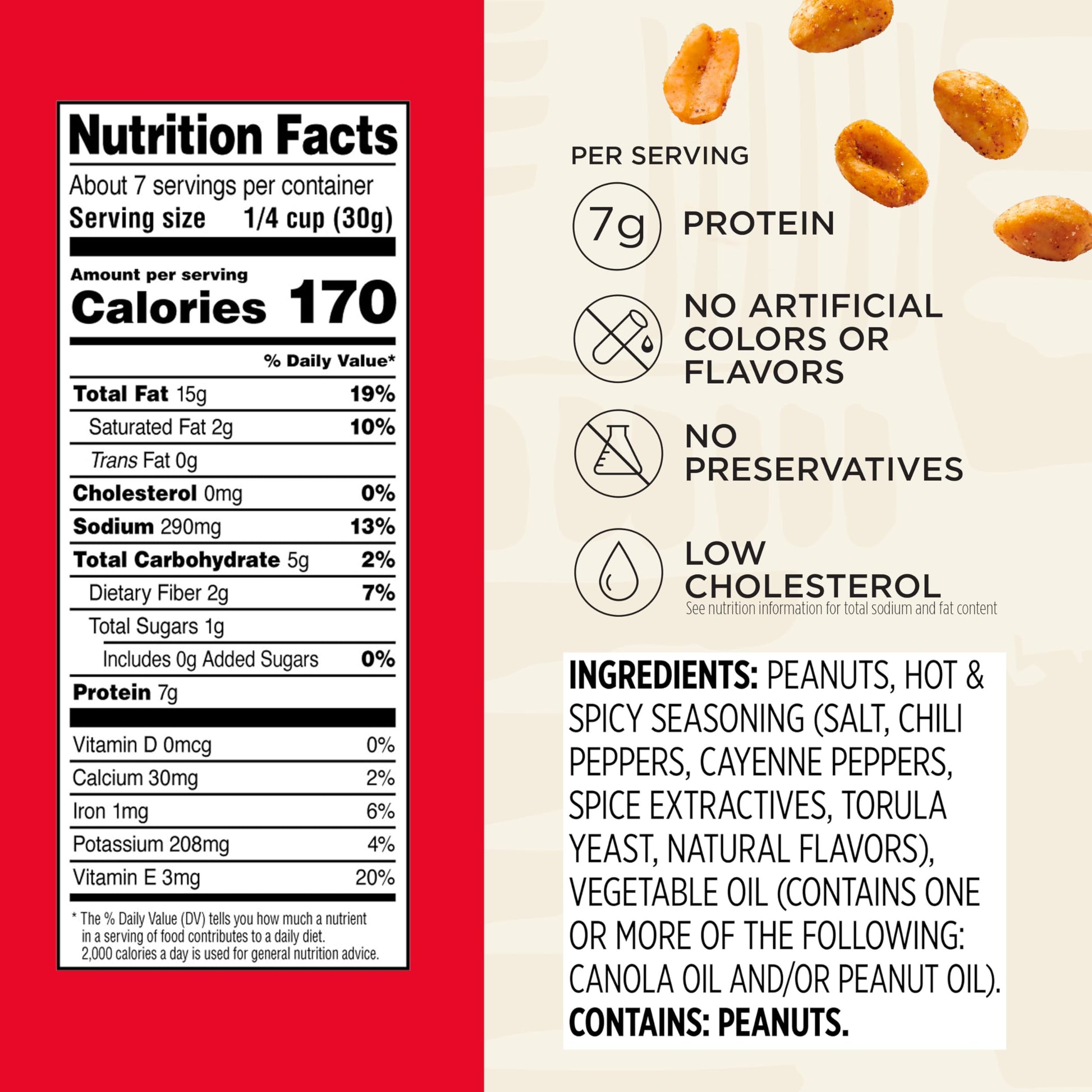 - Q: How much protein do these peanuts contain? A: Each serving of Snak Club Hot and Spicy Peanuts contains 7 grams of protein, making them a great energy-boosting snack option for throughout the day.