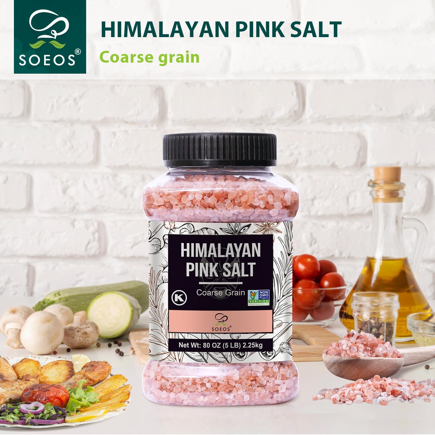 - Q: What size is the Soeos Himalayan pink salt package? A: The Soeos Himalayan pink salt comes in an 80-ounce (5-pound) package, providing a generous supply for all your cooking and seasoning needs.