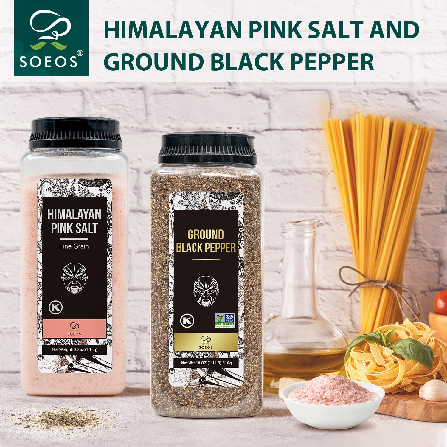 Soeos Himalayan Pink Salt Fine 39 oz + Organic Ground Black Pepper 18 oz, Salt and Pepper for Grinder Refill