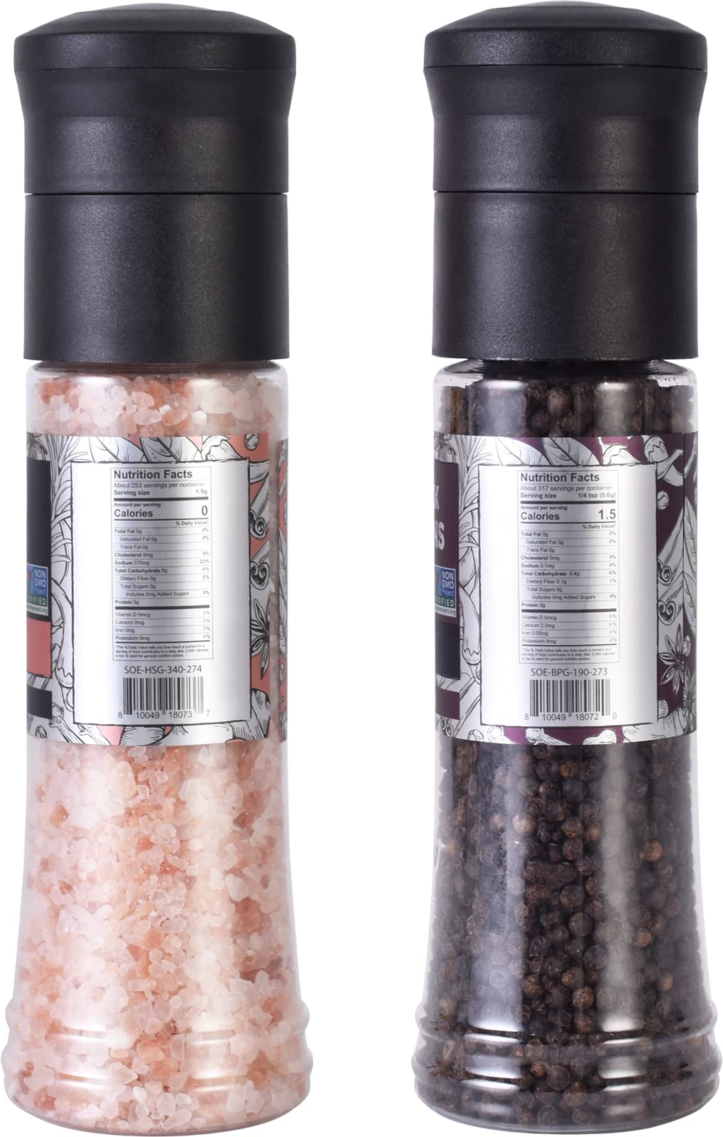 - Q: What are the key features of the Soeos Whole Black Peppercorns and Himalayan Pink Salt set? A: The Soeos set includes whole black peppercorns and Himalayan pink salt in a convenient plastic bottle grinder. It features a clear design for easy visibility of contents, an ergonomic handle for comfortable grinding, and a non-corrosive grinder that retains the fresh taste of spices. It also comes pre-filled, making it ready to use right out of the box.