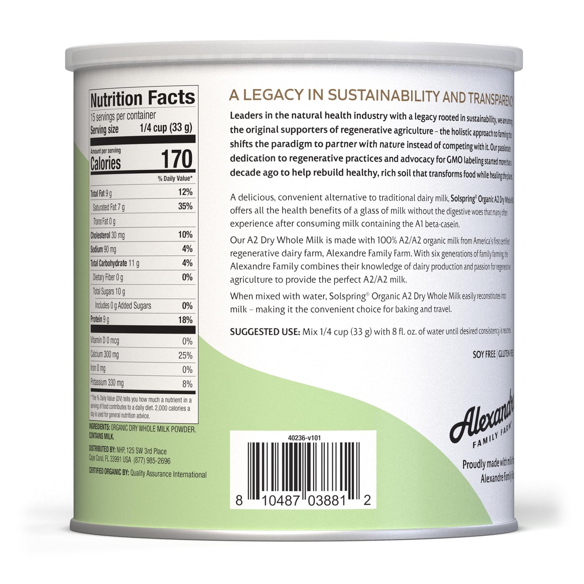 - Q: Where is Solspring Organic A2 Dry Whole Milk sourced from? A: Solspring Organic A2 Dry Whole Milk is sourced from the Alexandre Family Farm, recognized as the first Regenerative Organic Certified dairy farm in the U.S. This commitment to regenerative farming practices ensures high-quality milk.