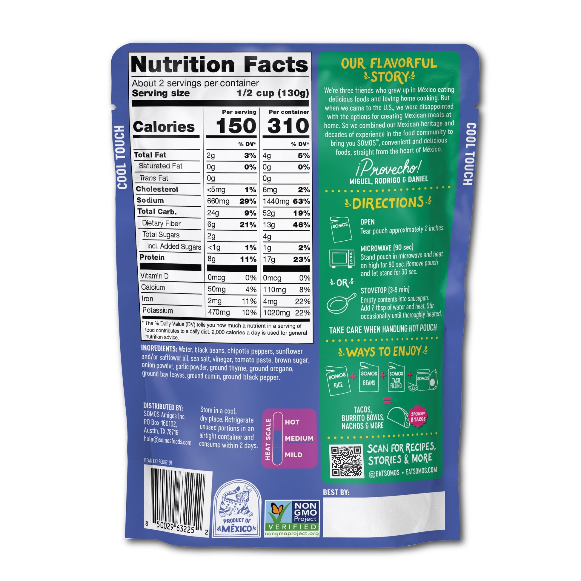 Q: What is the packaging size of SOMOS Chipotle Refried Black Beans?A: SOMOS Chipotle Refried Black Beans come in 10-ounce pouches, with each pack containing 6 pouches, perfect for sharing or meal prepping.