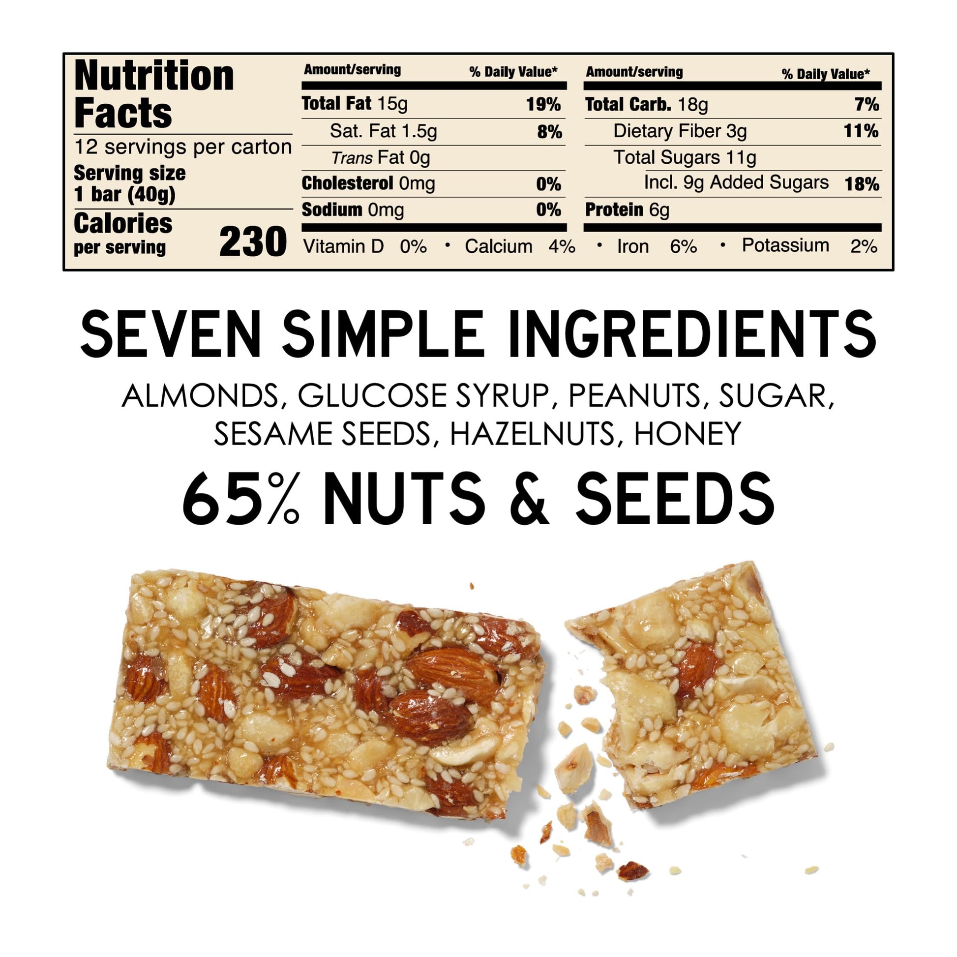 Q: What are the main ingredients in South 40 Snacks Mixed Nut Bar?A: The South 40 Snacks Mixed Nut Bar is made with seven simple ingredients: almonds, hazelnuts, peanuts, sesame seeds, honey, sugar, and a touch of salt. This ensures a delicious and healthy snack without any mystery additives.