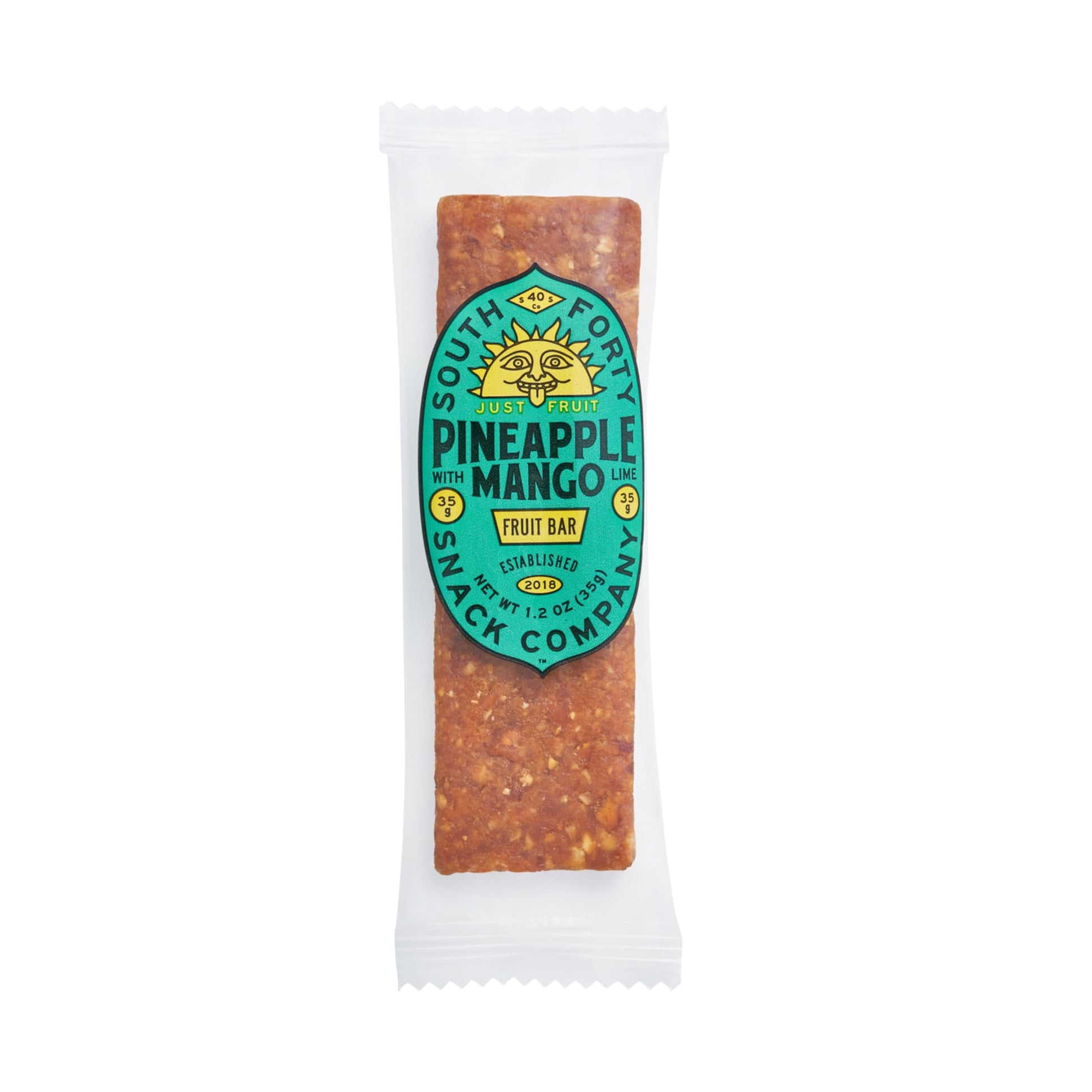 Q: How many bars come in a pack and what is their size?A: Each pack of South 40 Snacks Tropical Pineapple Mango Lime Fruit Bars contains 18 bars, and each bar weighs 35 grams.