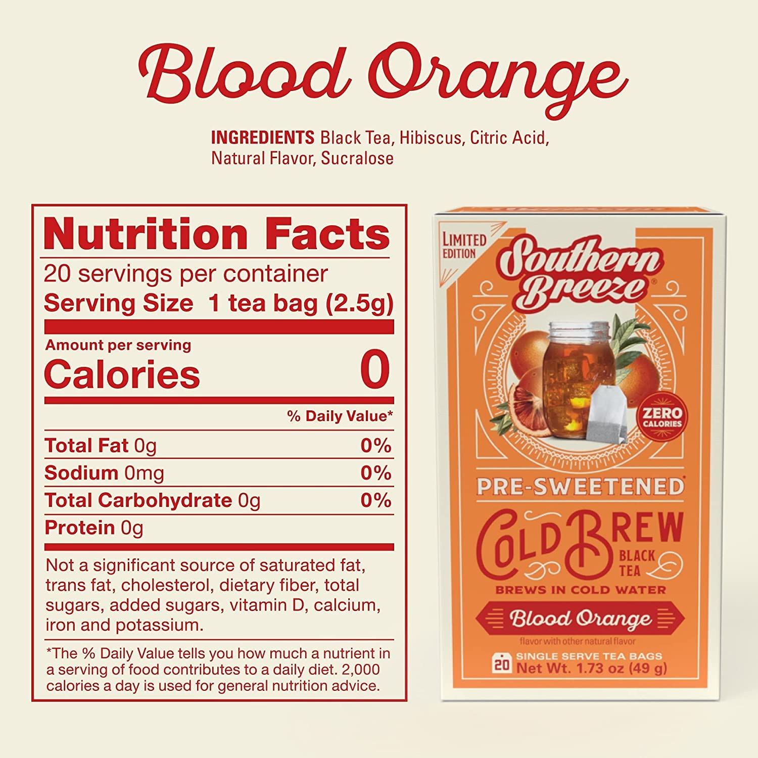Southern Breeze Cold Brew Sweet Tea Blood Orange Iced Tea With Black Tea And Zero Carbs Zero Sugar, 20 Individually Wrapped Tea