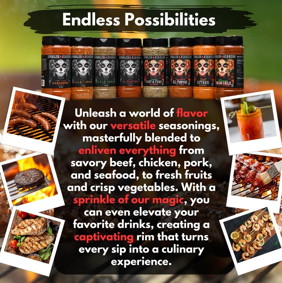 - Q: What types of dishes can I use Spanglish Asadero seasoning on? A: Spanglish Asadero seasoning is versatile and can be used on a variety of dishes, including carne asada, pollo asado, grilled steak, chicken wings, shrimp, prime rib, grilled veggies, tacos, and more.