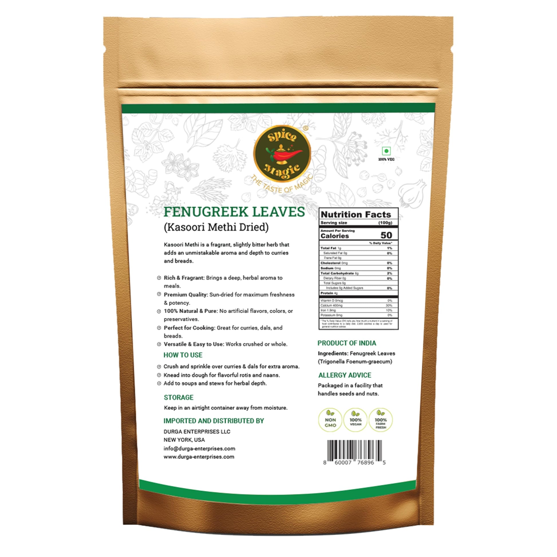 - Q: What are the culinary uses of SPICE MAGIC Fenugreek Leaves? A: SPICE MAGIC Fenugreek Leaves, also known as Kasoori Methi, are versatile herbs perfect for enhancing the flavor of a variety of dishes including Indian curries, dals, Mediterranean recipes, and Middle Eastern delicacies. They can be used in spice blends, pickles, chutneys, and even vegetable dishes to add a distinct, slightly bitter taste.