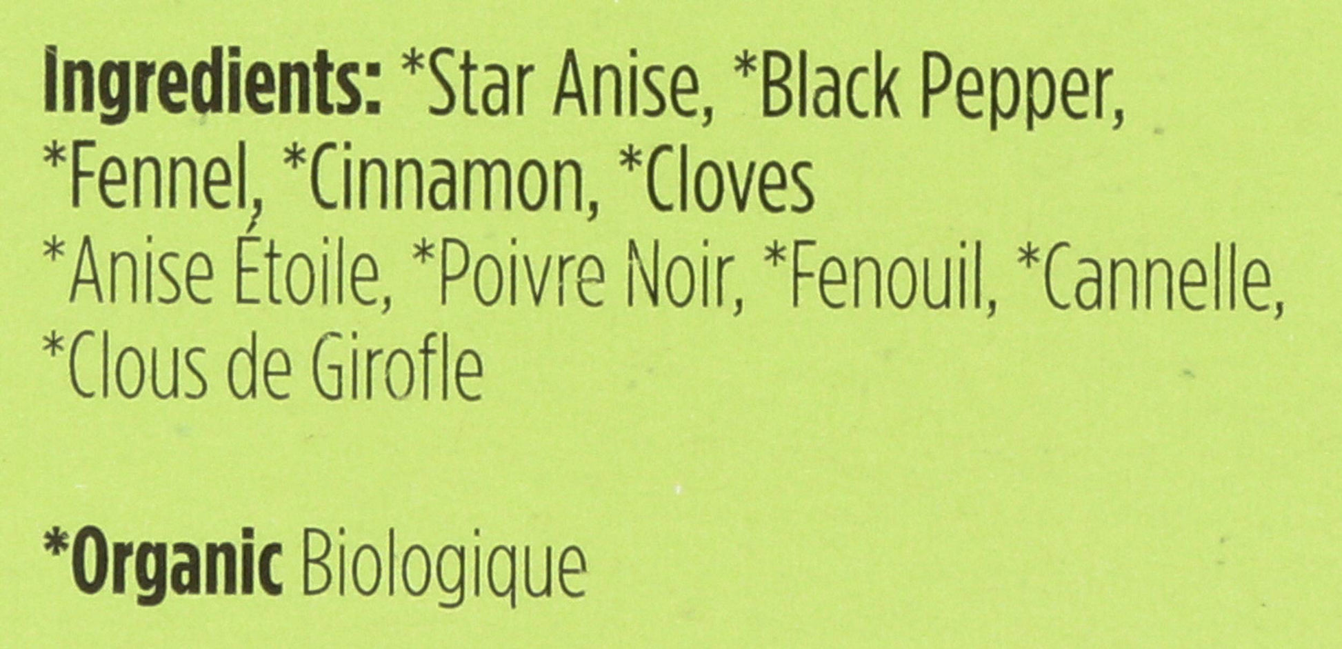 Chinese five spice adds a unique, potent flavor to any Asian food dish. Use it in marinades or as a rub for meat, poultry and fish, or add it to rice and vegetable dishes. One or two teaspoons in any stir-fry dish is also a tasty addition. For something different, try adding it to muffins, breads, waffles, cookies or scones. Ingredients: organic star anise, organic fennel, organic black pepper, organic cinnamon, and organic cloves.