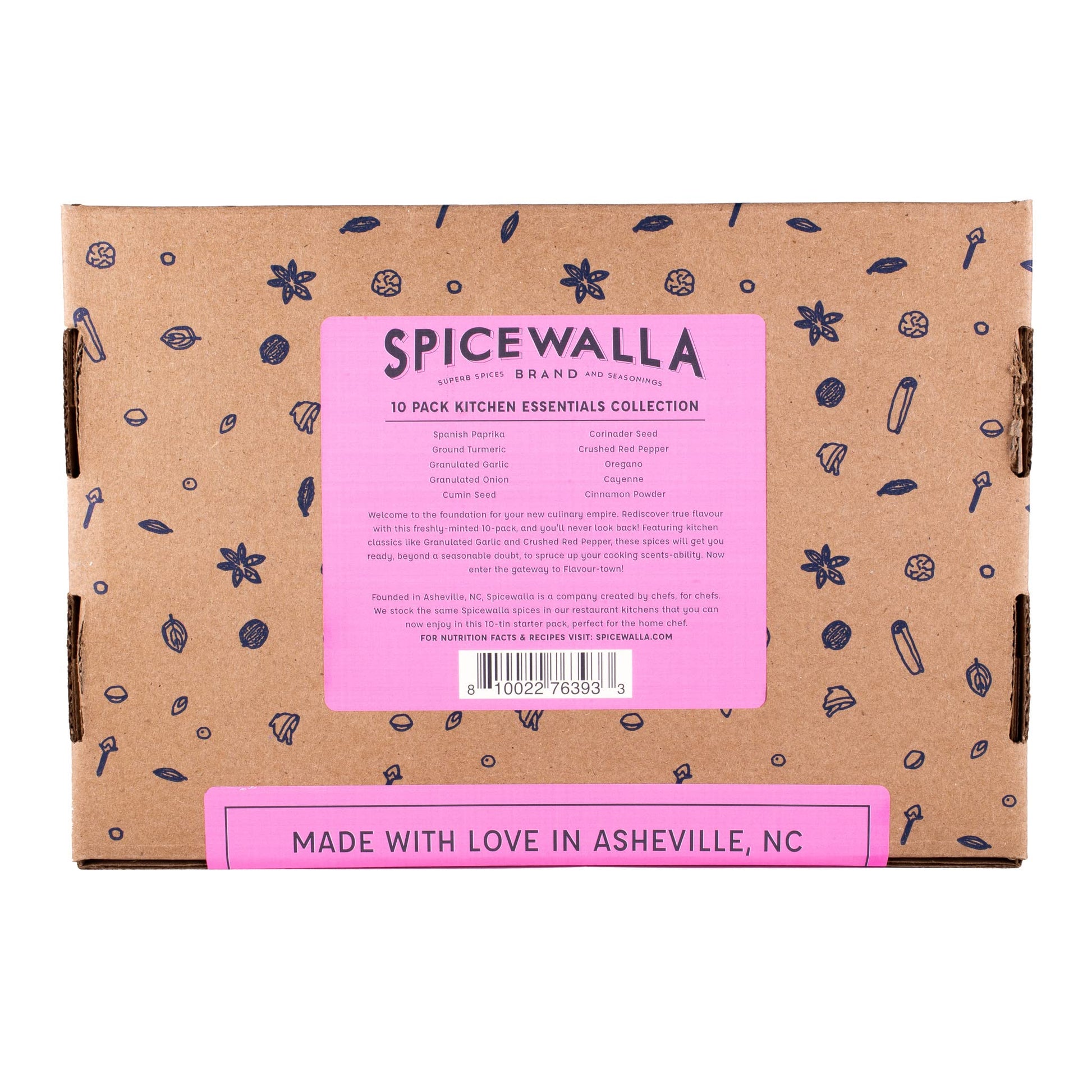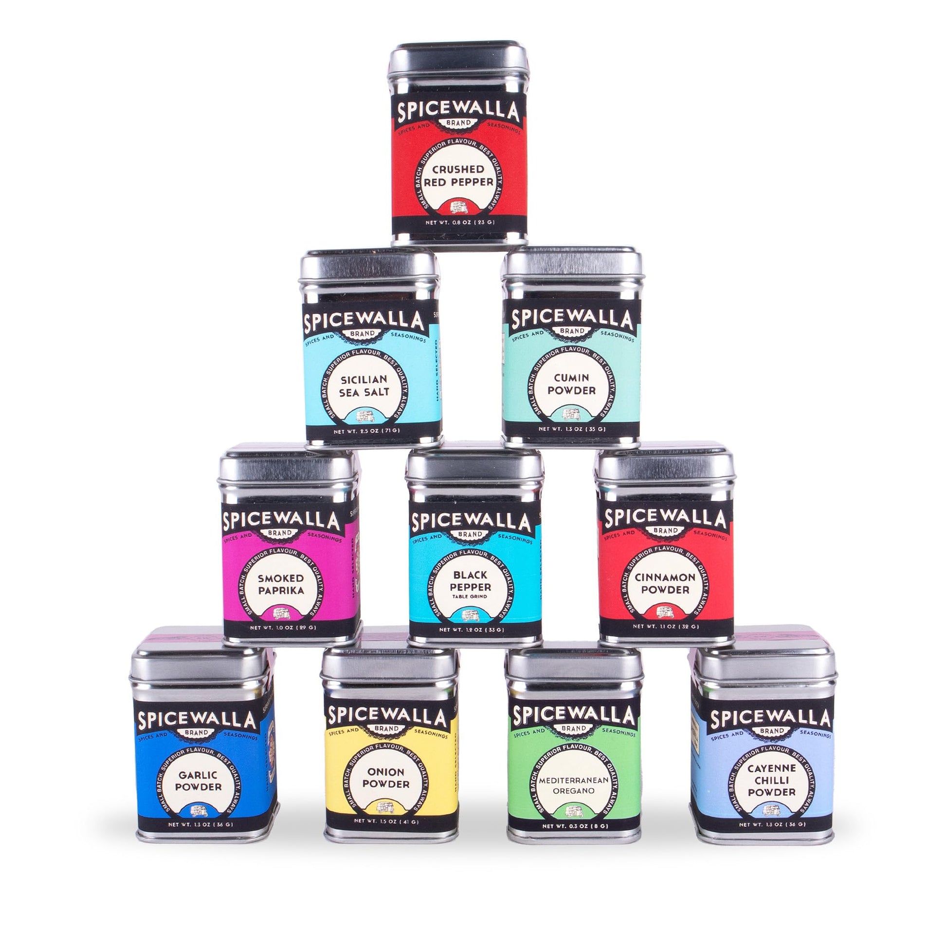 - Q: What spices are included in the Spicewalla Essential Spices and Seasonings Set? A: The Spicewalla Essential Spices and Seasonings Set includes a variety of 10 essential spices: Smoked Paprika, Ground Turmeric, Granulated Garlic, Granulated Onion, Cumin Seed, Coriander Seed, Crushed Red Pepper, Oregano, Cayenne Powder, and Cinnamon Powder.