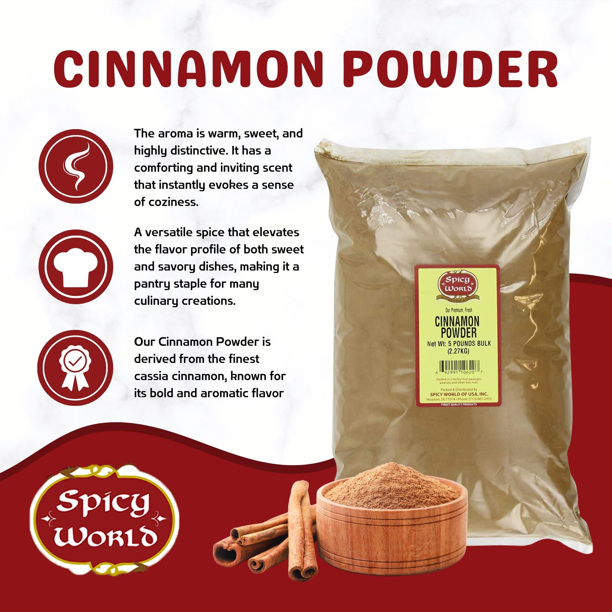 Spicy World Cinnamon Powder 5 Lb Bag - Lab Tested For Lead - Ground Cassia Cinnamon Bulk, Great Authentic Spice For Coffee, Tea, Baking & Oatmeal, Rich Flavor & Aroma