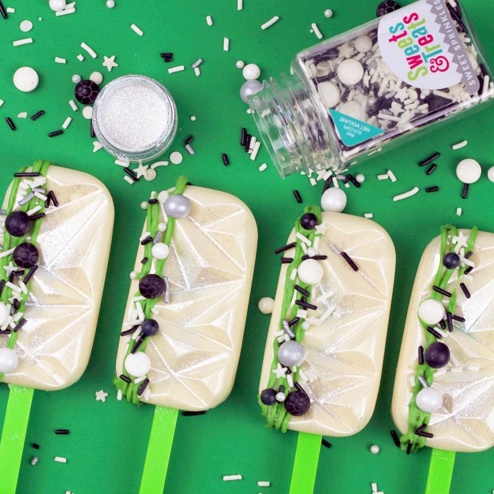 Cupcake decorations will never be the same without these Goal Keeper cake sprinkles. These cake decorations edible are packed with black jimmies, white soccer ball candies, black chocolate balls, white star quins, and silver nonpareils making these cupcake sprinkles the perfect sports sprinkles for cake decorating and baking just for you. Our cookie sprinkles brings life to your dessert and looks fabulous as it tastes. These cake sprinkles for decorating could also be added on top of your favorite ice cream or add to your smoothies!