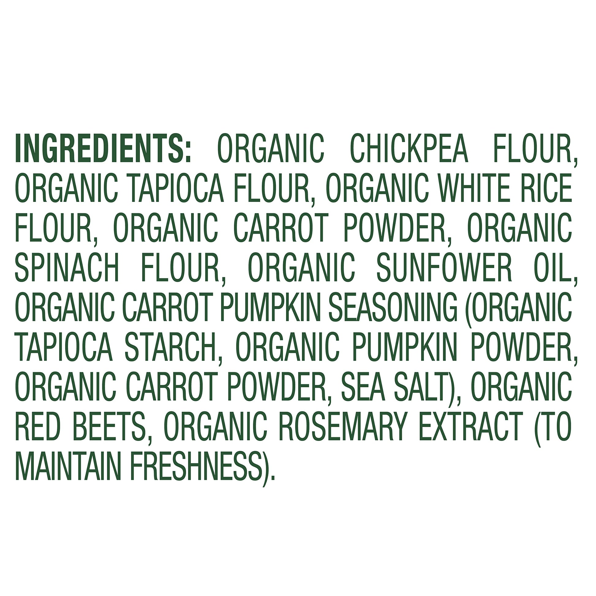 Q: What are the main ingredients in Sprout Organic Baby Food Crinklez?A: Sprout Organic Baby Food Crinklez are made with organic chickpeas and include colorful vegetables such as carrots, spinach, and beets, ensuring a nutritious snack for toddlers.