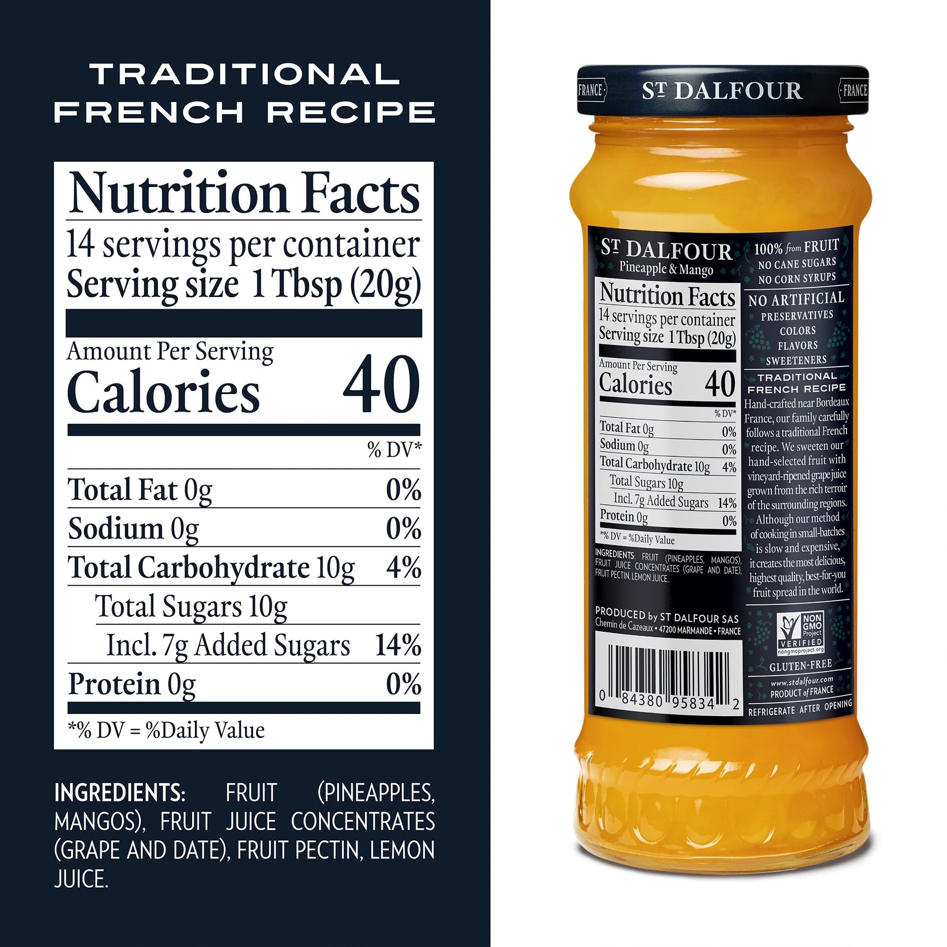 - Q: What are the main ingredients in St. Dalfour Pineapple & Mango Fruit Spread? A: St. Dalfour Pineapple & Mango Fruit Spread is made with 100% fruit and sweetened solely with fruit juice concentrates. It contains no artificial additives, synthetic nitrates or nitrites, ensuring a pure and wholesome fruit experience.