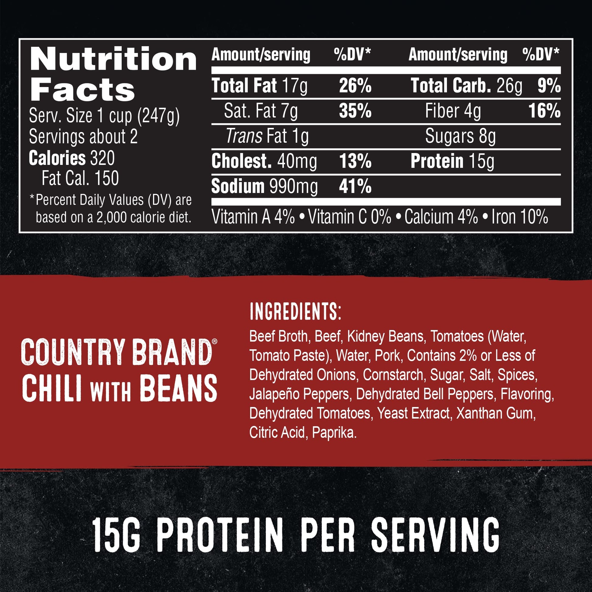 Q: What are the main ingredients in Stagg Country Brand Chili with Beans?A: Stagg Country Brand Chili with Beans features tender meats, plump beans, and a signature blend of flavorful spices, making it a hearty and satisfying meal option.