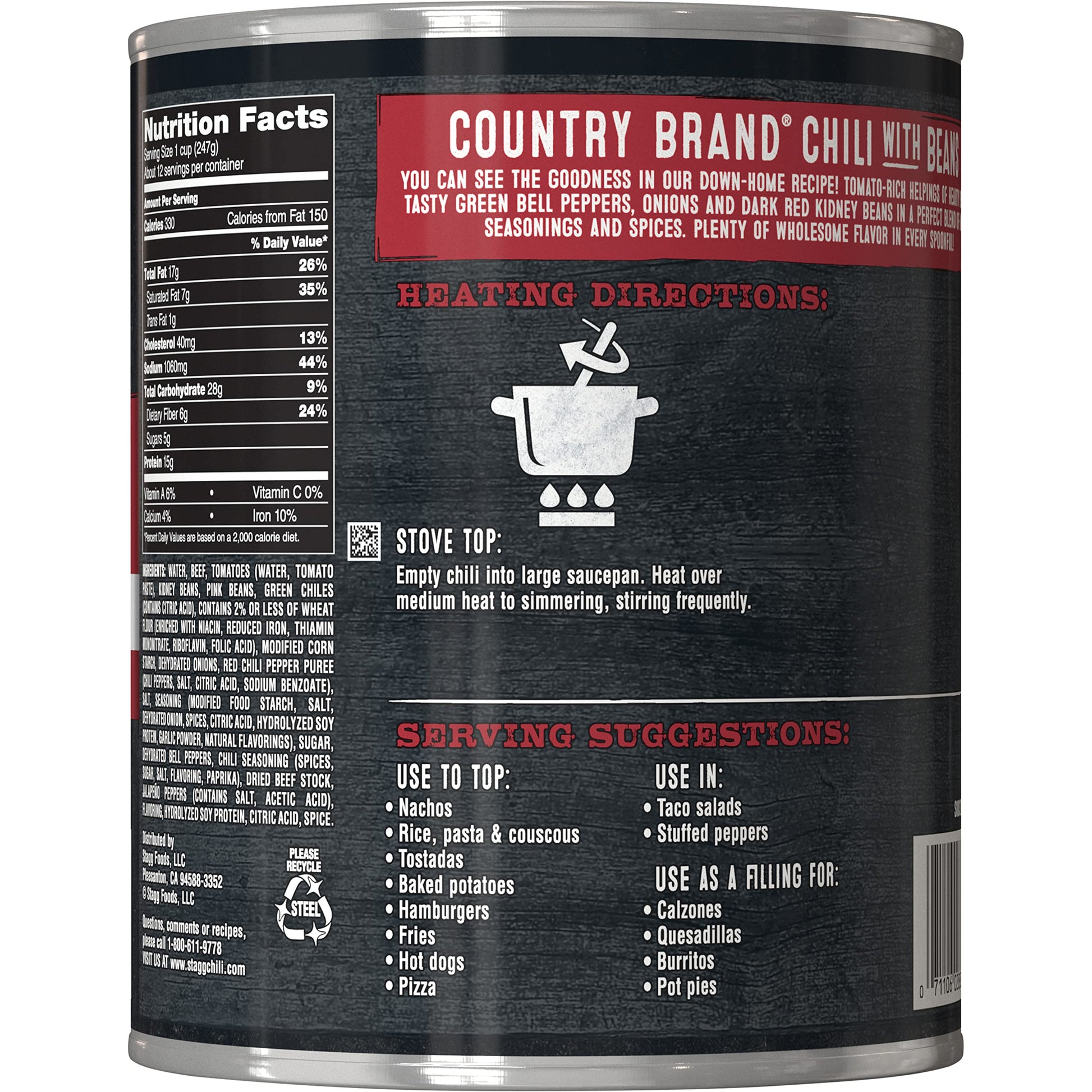 Q: Is Stagg Country Chili suitable for family meals?A: Yes, with its generous size of 108 ounces and hearty ingredients, Stagg Country Chili is perfect for family meals or gatherings.