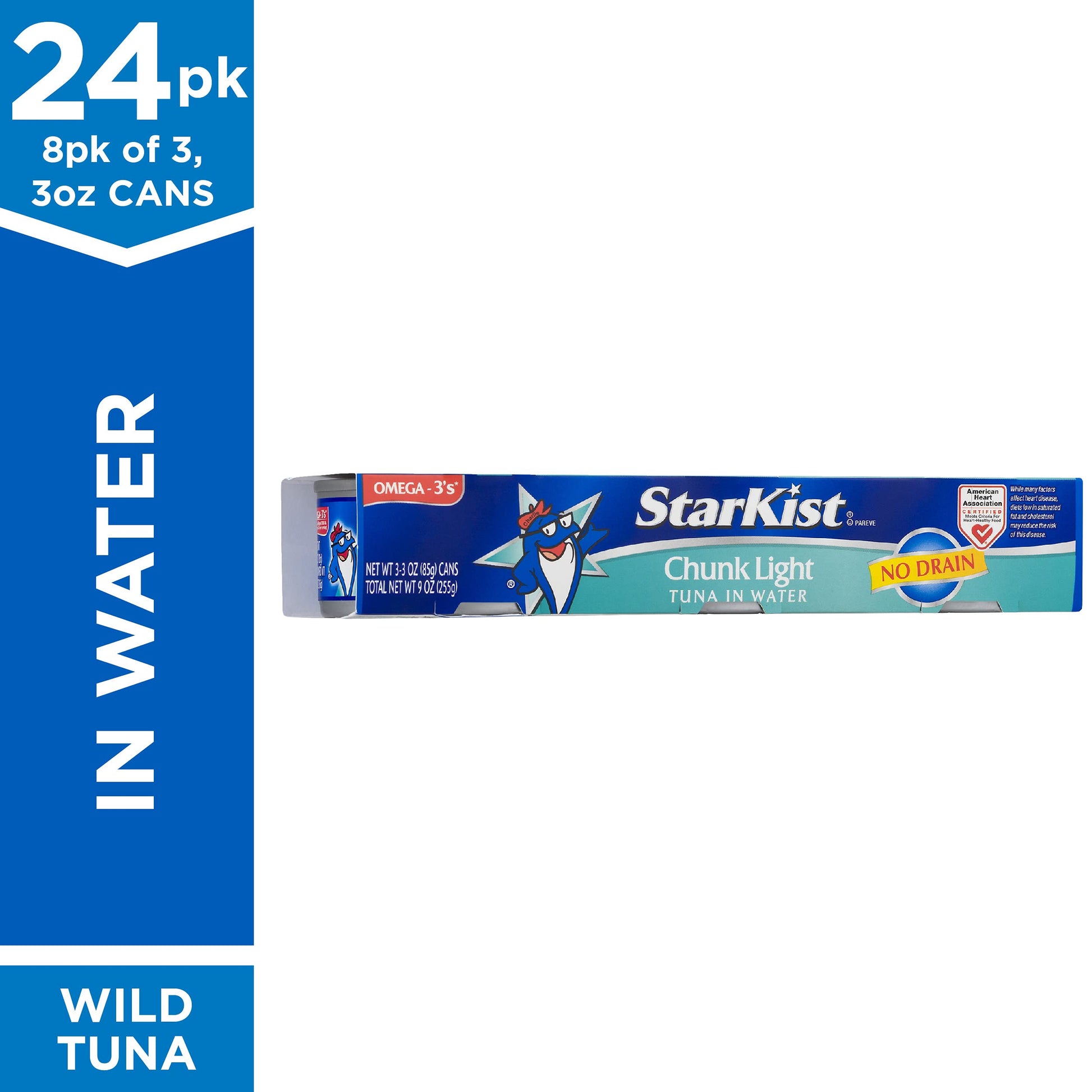 Q: What is the net weight of the StarKist Chunk Light Tuna in Water?A: The StarKist Chunk Light Tuna in Water comes in a pack size of 3 ounces, and this listing includes a pack of 8.