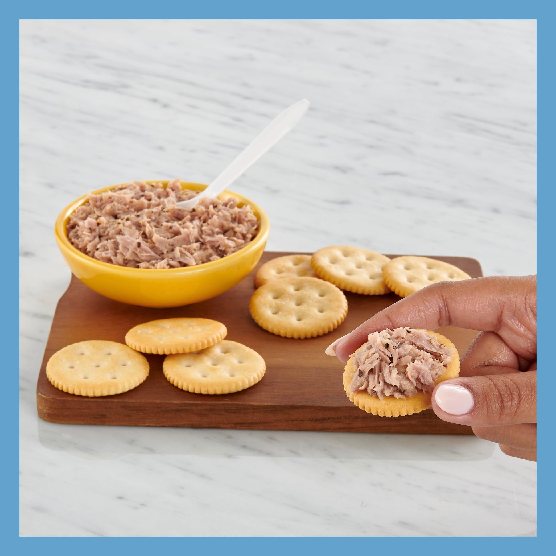 Q: How do I prepare the tuna salad with this kit?A: To prepare, simply tear open the Flavor Fresh Pouch, mix in the included reduced-calorie mayonnaise to your taste, and enjoy the tuna mixture on the crispy crackers.