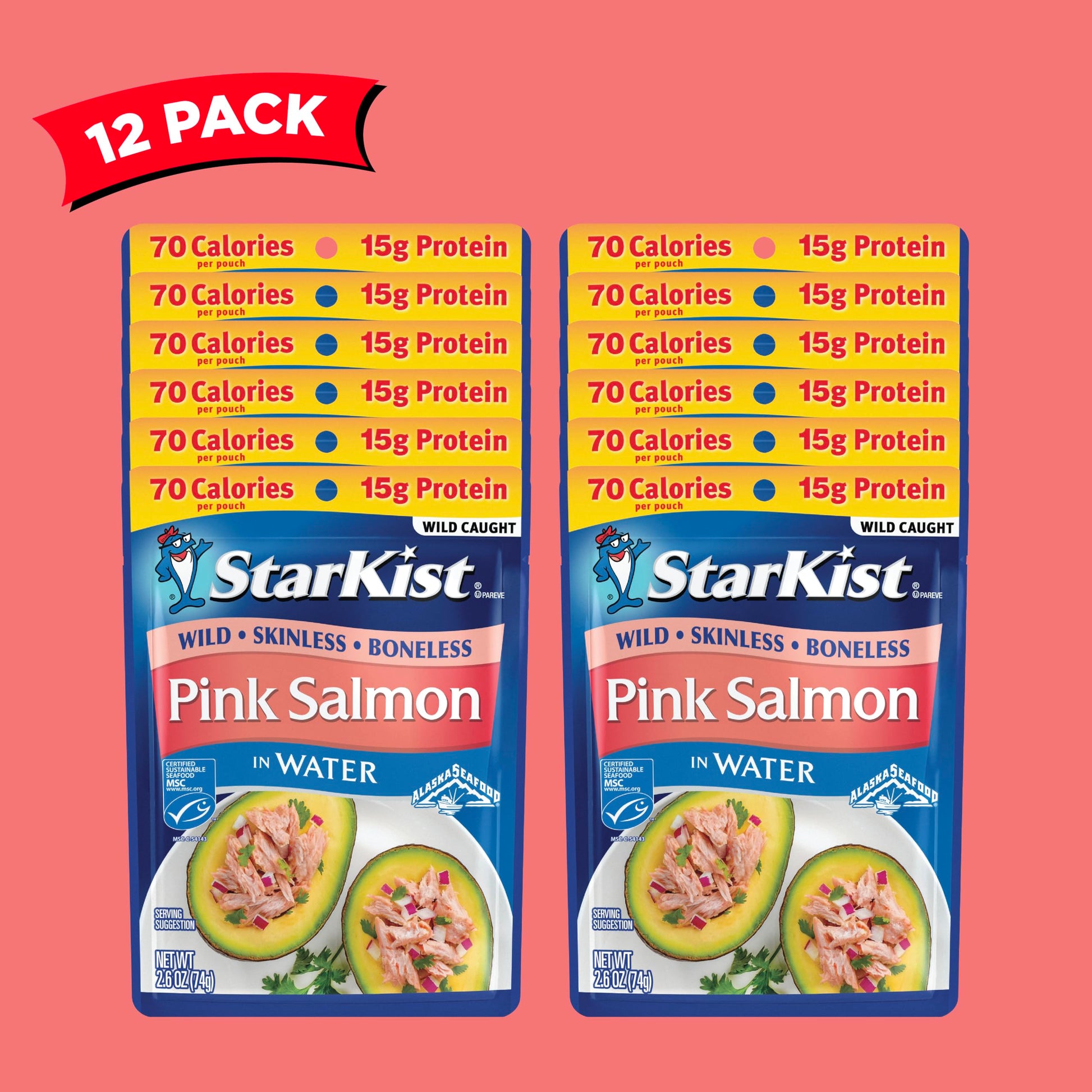 Q: How much protein is in a pouch of StarKist Wild Pink Salmon?A: Each 2.6 oz pouch of StarKist Wild Pink Salmon contains 15 grams of protein, making it a great source of lean protein for your meals or snacks.