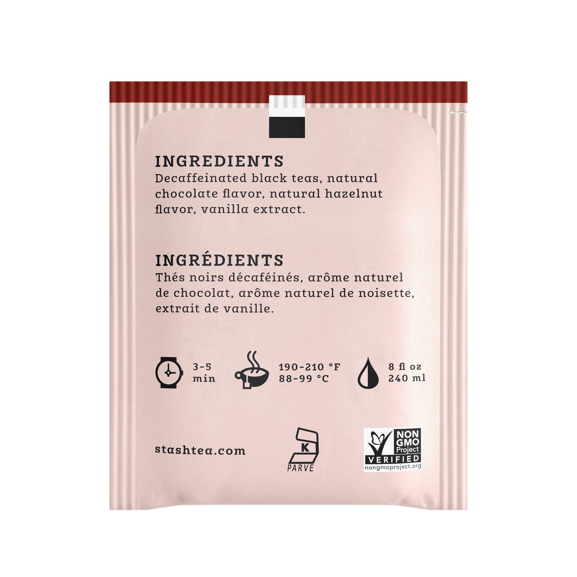 - Q: How should I brew Stash Tea Decaf Chocolate Hazelnut Black Tea for the best flavor? A: For optimal flavor, brew one tea bag in 8 oz of water at a temperature of 190-210°F for 3-5 minutes. This will ensure the perfect balance of flavors is extracted from the tea.