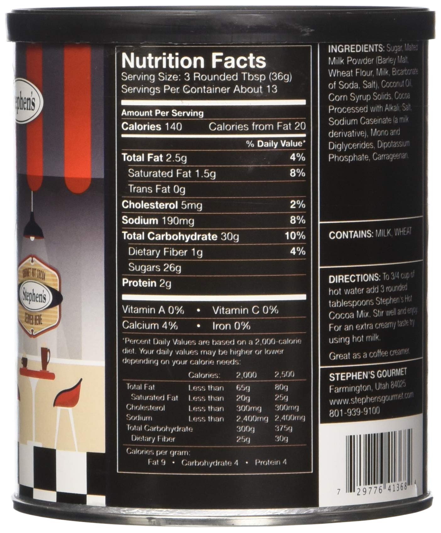Stephens Gourmet Hot Cocoa is made from the worlds finest ingredients, including the finest European cocoa, imported for its unforgettable aroma and remarkable consistency in flavor and texture. While other companies cut costs with the use of cheaper and less consistent cocoas, Stephens Gourmet settles for nothing but the best ingredients. In addition, Stephens Gourmet Hot Cocoas offer a larger portion per serving than other national brands of cocoa (36 grams per serving compared to 20-28 grams per serving). You can taste the difference!