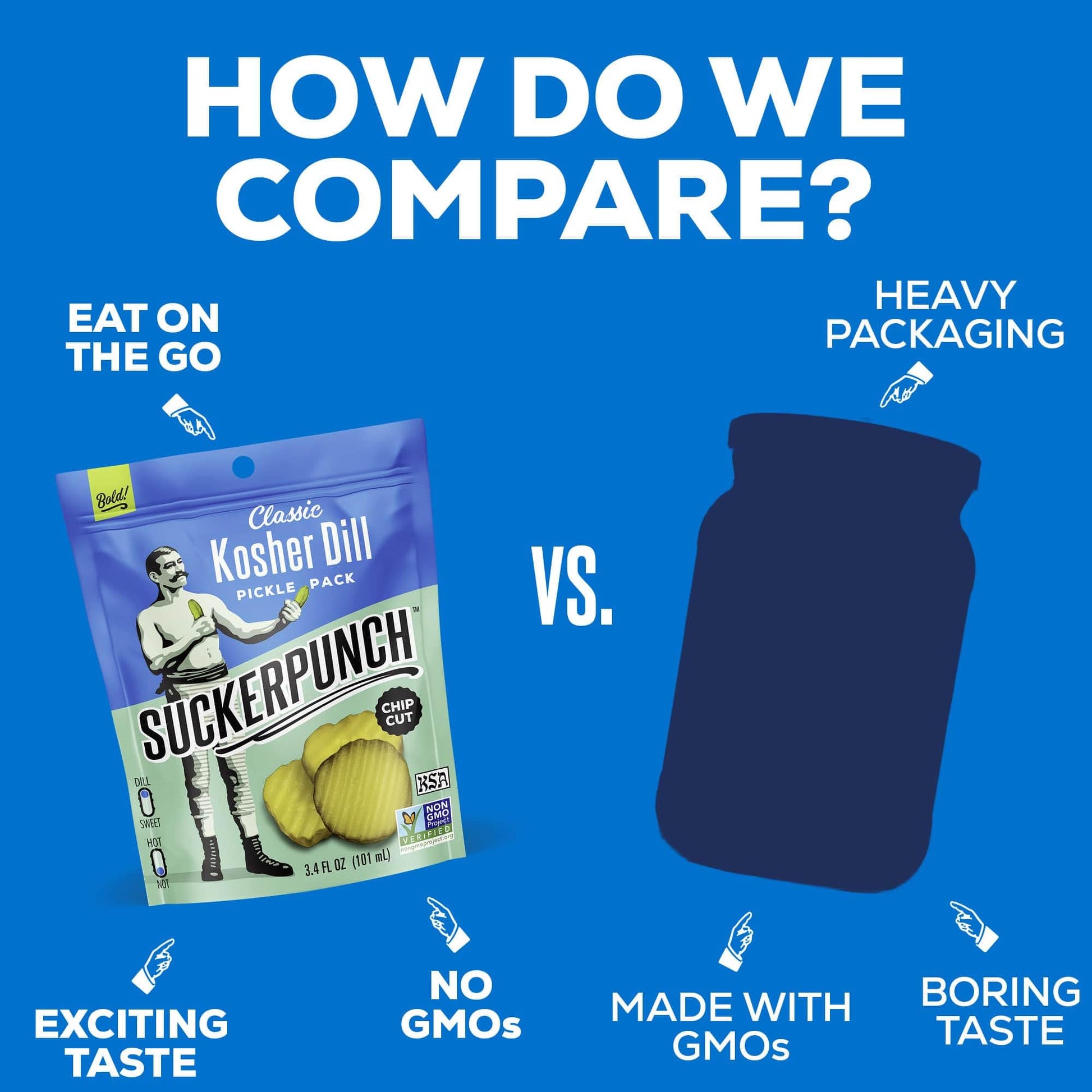- Q: How can I enjoy SuckerPunch Dill Pickle Chips? A: SuckerPunch Dill Pickle Chips are perfect for on-the-go snacking. They can be enjoyed straight from the pouch, or as a flavorful addition to sandwiches, burgers, or even charcuterie boards.
