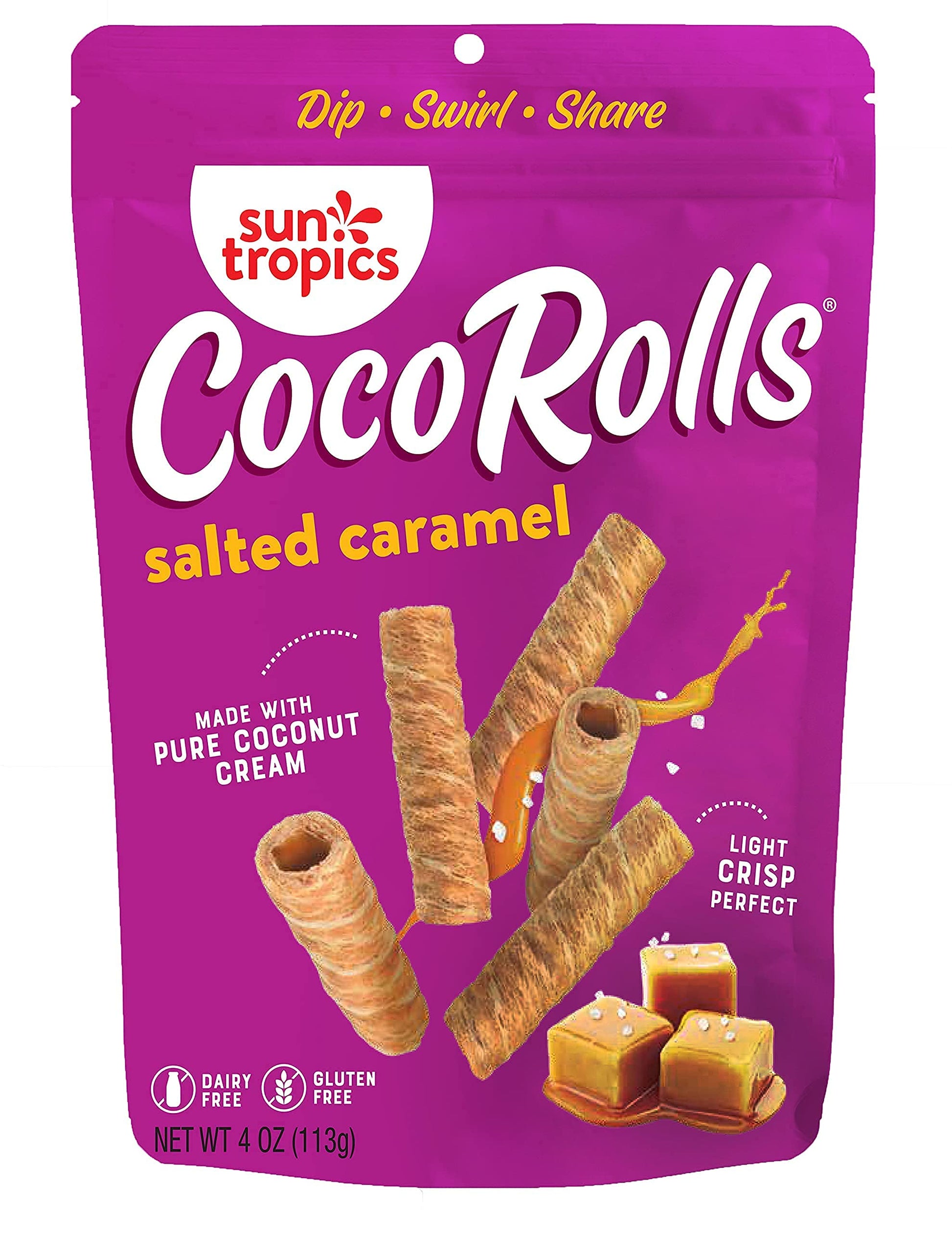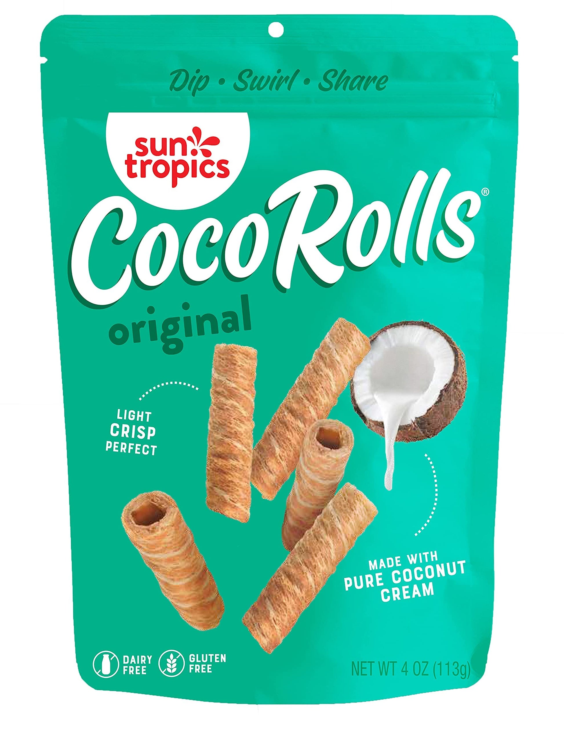 Q: How can I enjoy Sun Tropics CocoRolls?A: You can enjoy Sun Tropics CocoRolls in various ways: dip them in your morning coffee, swirl them into yogurt or ice cream, or simply enjoy them straight out of the bag as a crunchy snack.