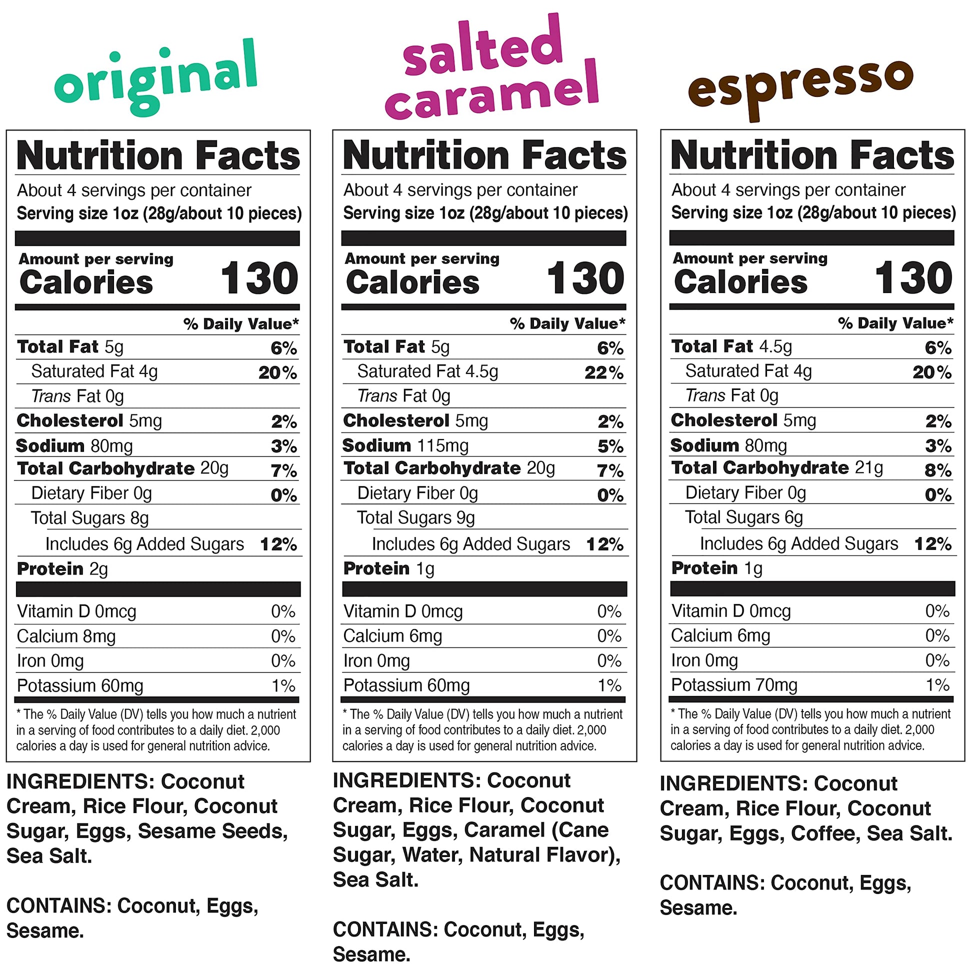 Q: What flavors are included in the Variety Pack of Sun Tropics CocoRolls?A: The Variety Pack of Sun Tropics CocoRolls contains six 4oz bags, featuring two Original, two Espresso, and two Salted Caramel flavors, providing a delightful mix for every taste preference.