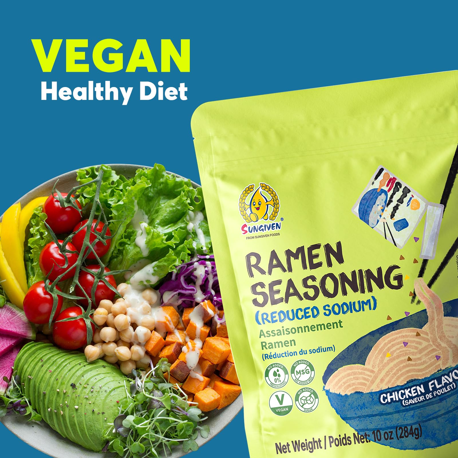 Q: Is the SUNGIVEN Chicken Instant Ramen Seasoning Powder suitable for vegans?A: Yes, the SUNGIVEN Chicken Instant Ramen Seasoning Powder is 100% vegan, making it a great choice for those following a plant-based diet.