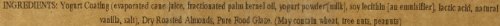 Q: What are the main ingredients in Sunridge Farms Yogurt Covered Almonds?A: Sunridge Farms Yogurt Covered Almonds are made with all-natural ingredients, free of fillers and chemicals, ensuring a gluten-free snack with no trans fats.