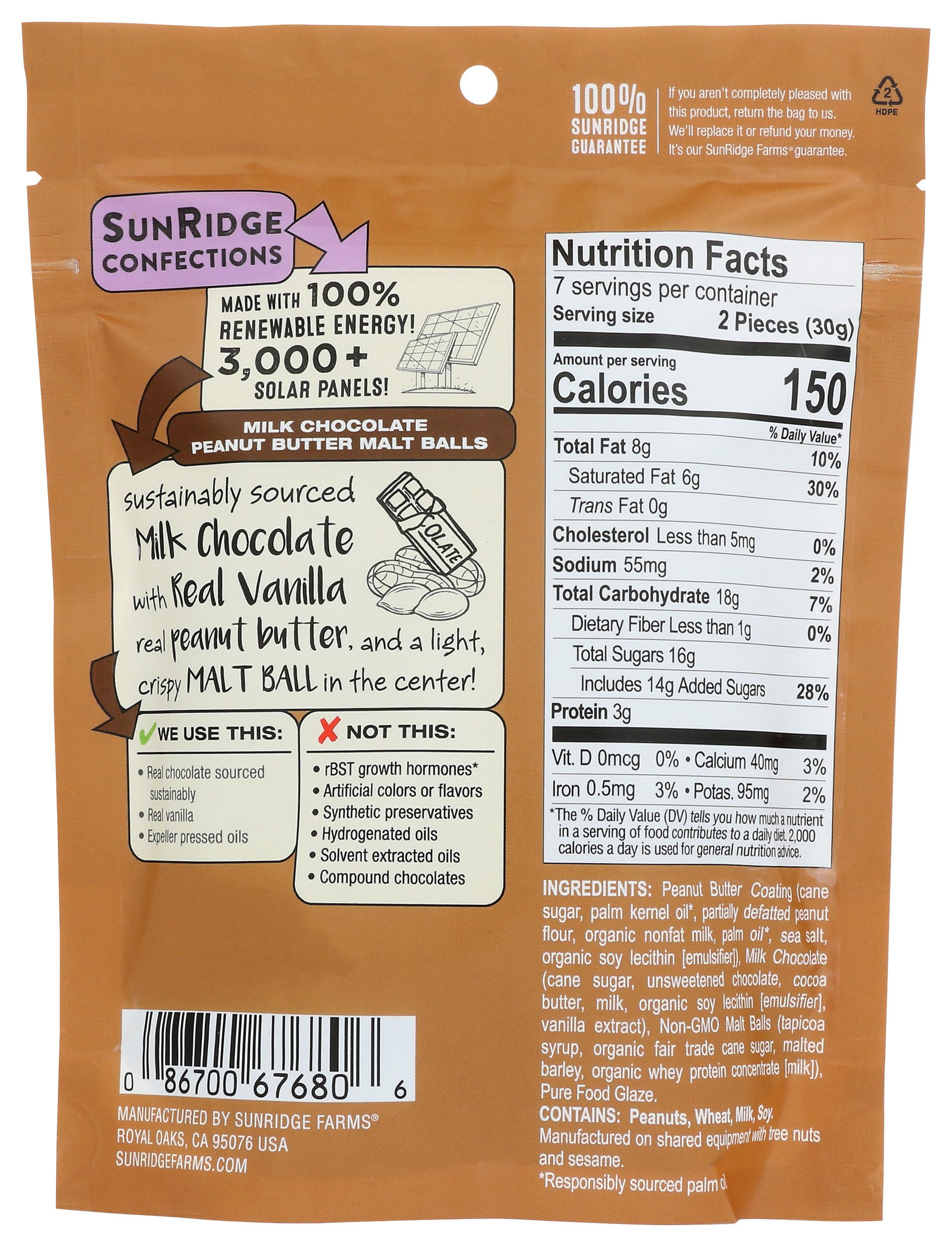 Q: What are the main ingredients in SUNRIDGE FARMS Milk Chocolate Peanut Butter Malt Balls?A: SUNRIDGE FARMS Milk Chocolate Peanut Butter Malt Balls are made with quality ingredients and do not contain hydrogenated fats, high fructose corn syrup, bleached flour, or synthetic nitrates and nitrites.