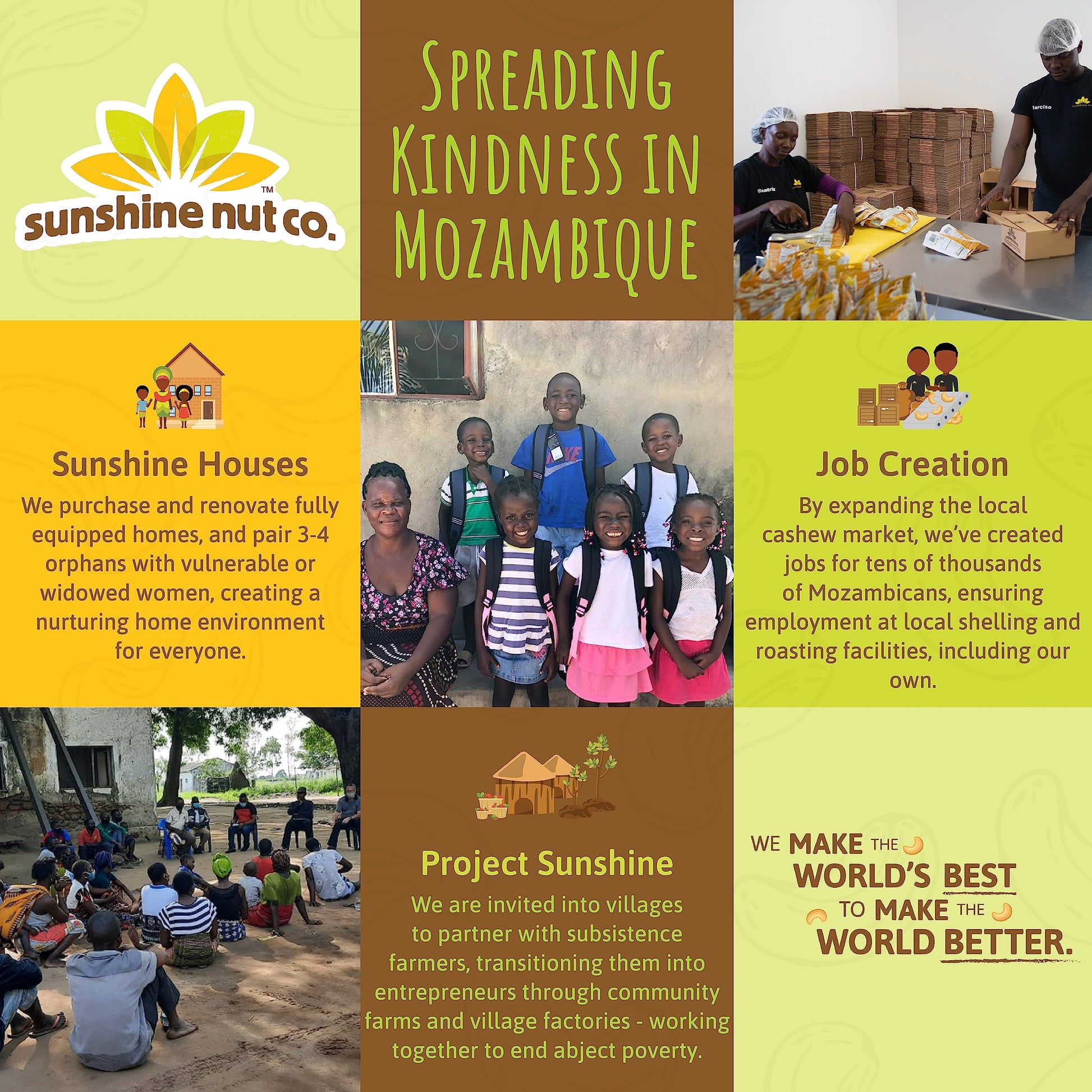 Q: Where are these cashews sourced from?A: These cashews are sourced from Mozambique, where they are locally harvested and processed to ensure fresh-tasting nuts while supporting local farmers.