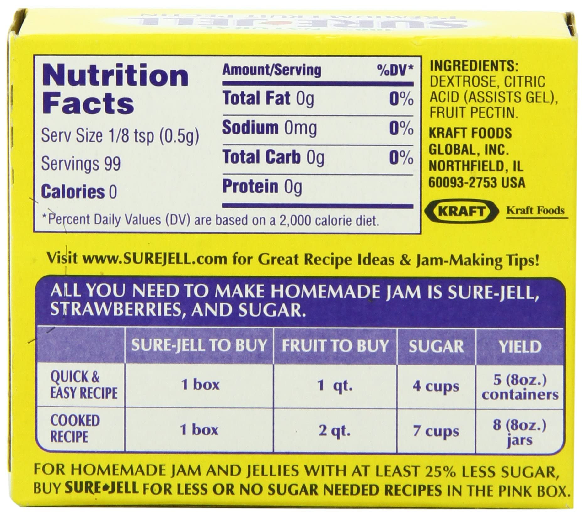 Q: Is Sure Jell suitable for sugar-free recipes?A: Yes, Sure Jell is designed to be used in sugar-free recipes, making it a great option for those looking to reduce sugar intake while still enjoying homemade jams and jellies.