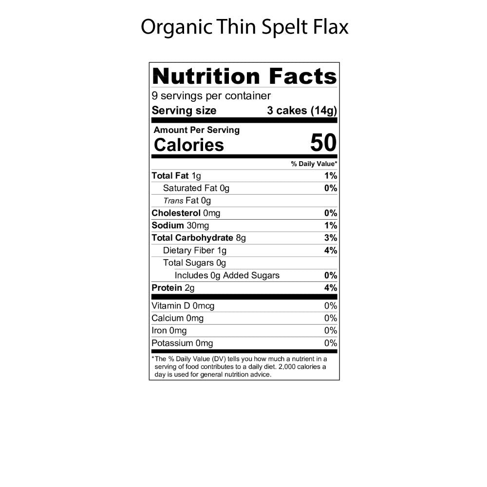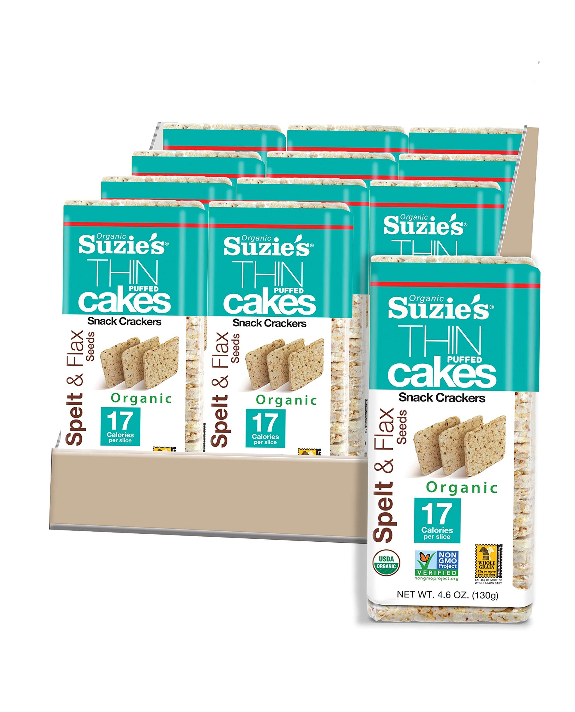 Q: What are Suzie's Thin Cakes made of?A: Suzie's Thin Cakes are made from natural whole grains, specifically featuring spelt and flax seeds, making them a healthy snack option.