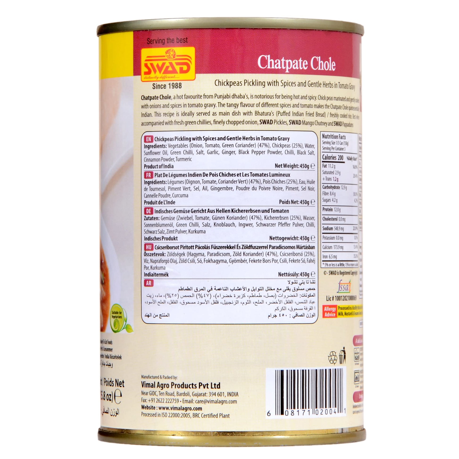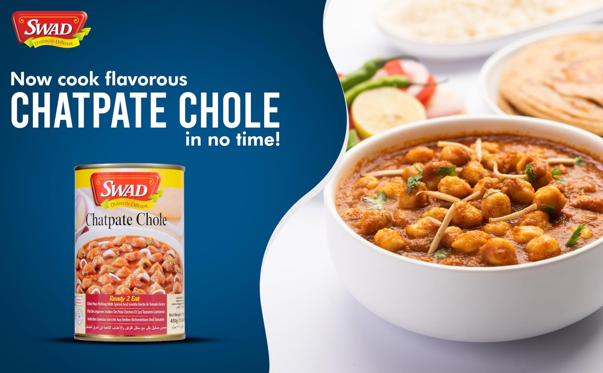 DescriptionA spicy mix of chickpeas cooked in tomato and onion gravy, Swad Chatpate Chole is for everyone who loves spicy food. Its an authentic recipe that ensures conventional taste from Punjab. The aroma and distinctive flavour will definitely linger on in your mind for a very long time. You can serve it with boiled rice, mutter pulaao, biryani, bhature, kulche, naan, tandoori roti or any other flat bread. The taste of traditional flavours, herbs and seasoning, packed with love and fragrance of home cooked meals is Swad primary promise. With dual income households where both men and women are working, Swad Ready-To-Eat range is gaining a lot of popularity. It is also a boon for students away from home for college, and for people working in different cities and even countries. The ease of preparation along with authentic taste is one of the biggest reasons why this category is the most loved by people across the globe.The ease of preparation along with authentic taste is one of the biggest reasons why this category is the most loved by people across the globe.