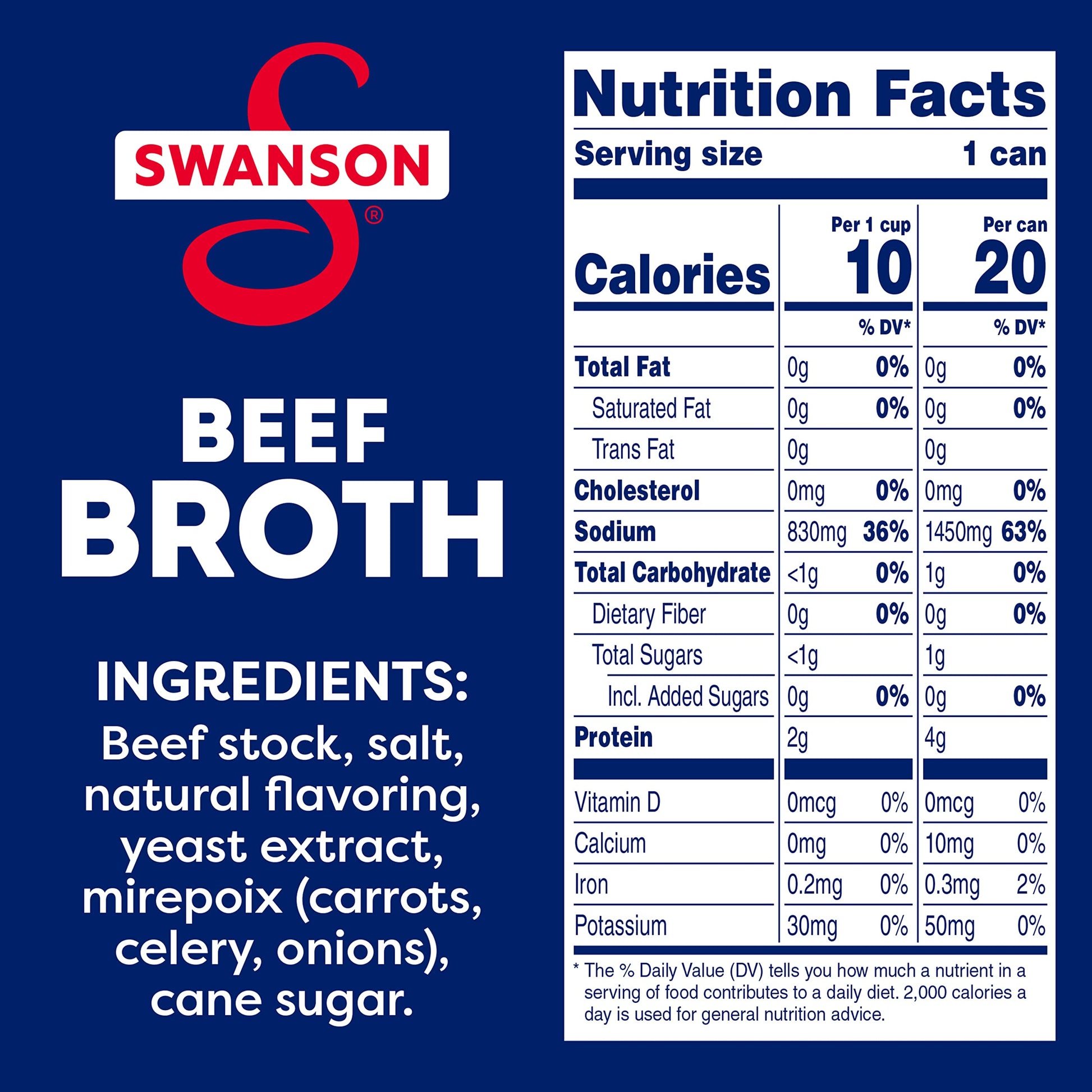 Elevate your homemade meals with the rich roasted flavor of Swanson Beef Broth. Swansons canned beef broth brings together the perfectly balanced flavors of roasted beef and vegetables picked at the peak of freshness in a convenient recyclable can. And just like homemade, our canned broth uses only 100% natural (1), non-GMO ingredients, with no MSG added (2), no artificial flavors or colors, and no preservatives. More convenient than beef bouillon, this fat-free, gluten-free beef broth is a versatile ingredient for your everyday cooking, adding flavor and moisture to both entrees and side dishes. Its great as a stew or soup base, and it can be used instead of water to boost rich flavor in rice, pasta and veggies. Swanson Beef Broth is a must-have for your holiday cooking, bringing richer, elevated homemade flavor to beef-centered recipes such as pot roast, brisket and more. Its not just any broth. Its Swanson. In addition to beef broth, Swanson offers a variety of other delicious broths, including Chicken and Vegetable. Try Swanson Beef Stock for even richer flavor and a heavier texture. (1) No artificial ingredients and only minimally processed (2) Except for the small amount naturally occurring in yeast extract
