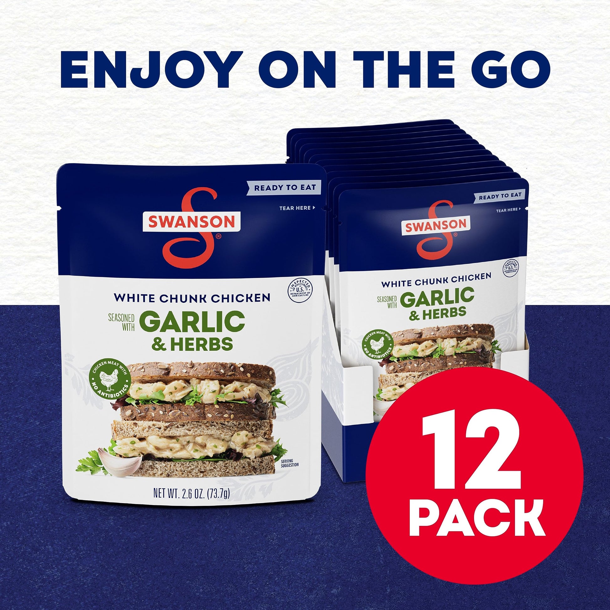 Key Features:- Twelve (12) 2.6-ounce pouches of Swanson Garlic and Herbs White Chunk Fully Cooked Chicken.