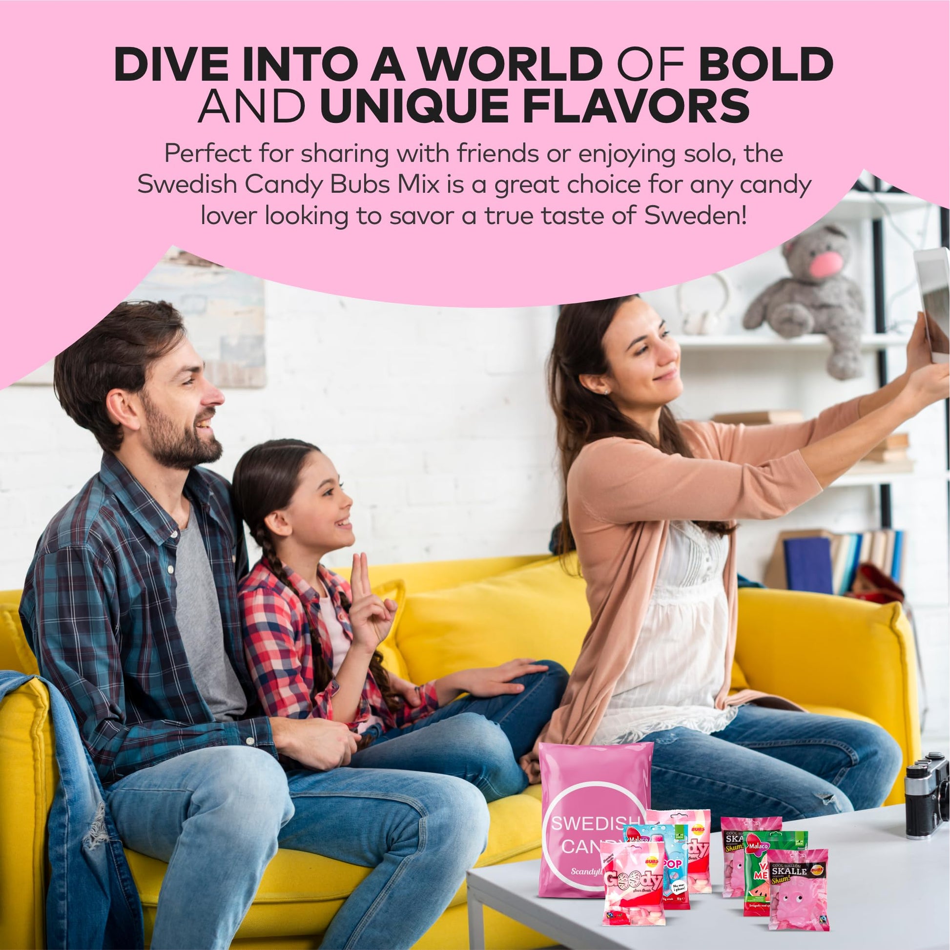 Q: What flavors are included in the Swedish Candy Bubs Mix?A: The Swedish Candy Bubs Mix features a delightful combination of both sour and sweet flavors, providing a unique taste experience with every bite.