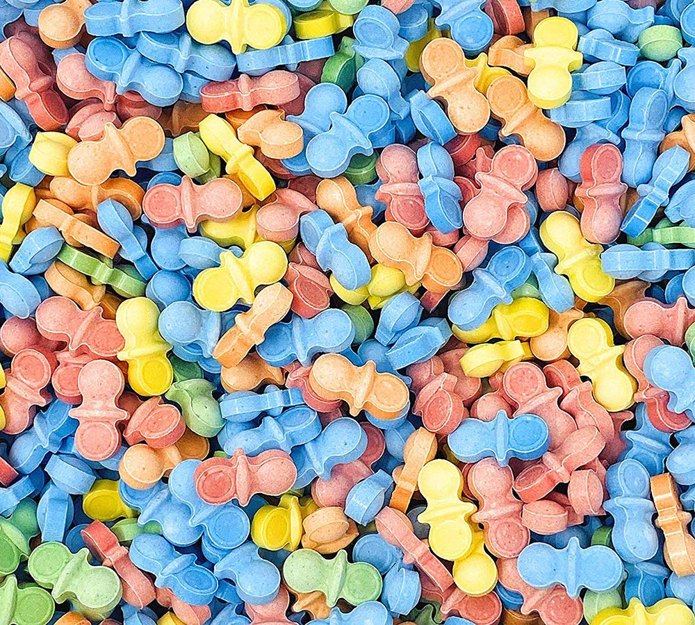 These delicious pressed powder candies were made for vending in candy machines and are great for decorations, gifts, and games at baby showers. Their soft pastel colors will attract attention in any candy vending machine. They are shaped and detailed to resemble real baby pacifiers!