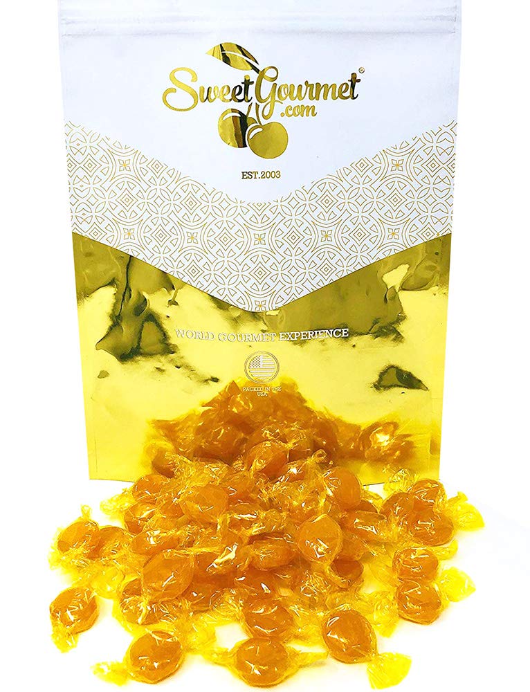 Q: What are SweetGourmet Butterscotch Buttons made of?A: SweetGourmet Butterscotch Buttons are premium hard candies made with traditional butterscotch flavor, ensuring a rich and authentic taste. They are individually wrapped for freshness and convenience.